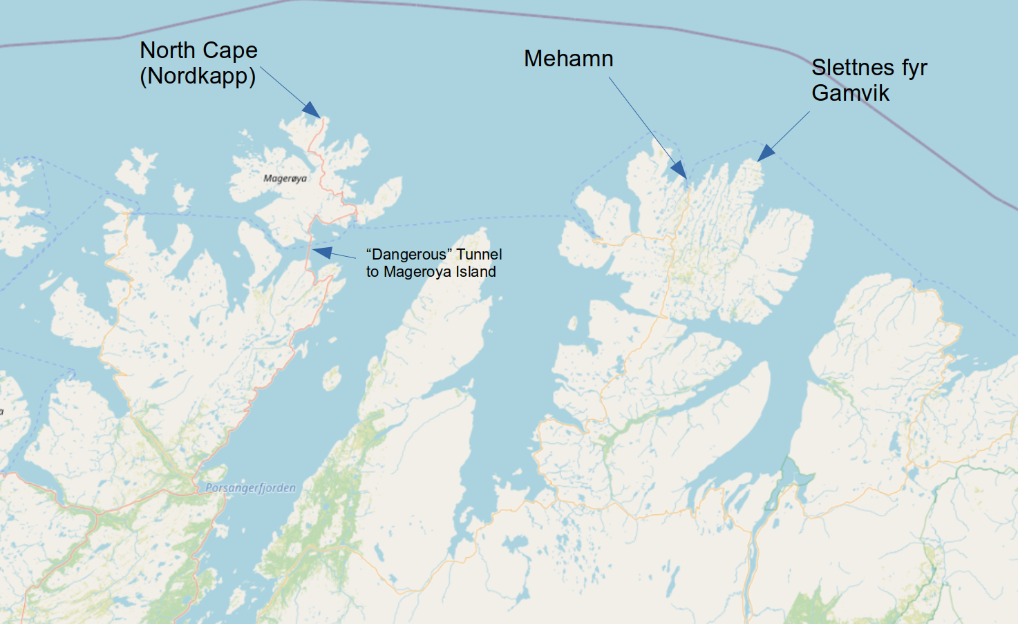 The end point was not so clear, the Nordkapp had always been my target, but reading about the unpleasant 10km subsea tunnel, an entrance fee (that may or may not be charged to cyclists) and the hundreds of camper vans that head there – I re-assessed the situation. The next furthest north point appeared to be Gamvik to the east, and to justify it further it forms part of the mainland and not on an island like the Nordkapp. Further reading showed Slettnes fyr, the most northerly lighthouse and the most northerly road – and it sounded a nice place with the added bonus of it having a Cafe, so there was no question – my destination was identified!