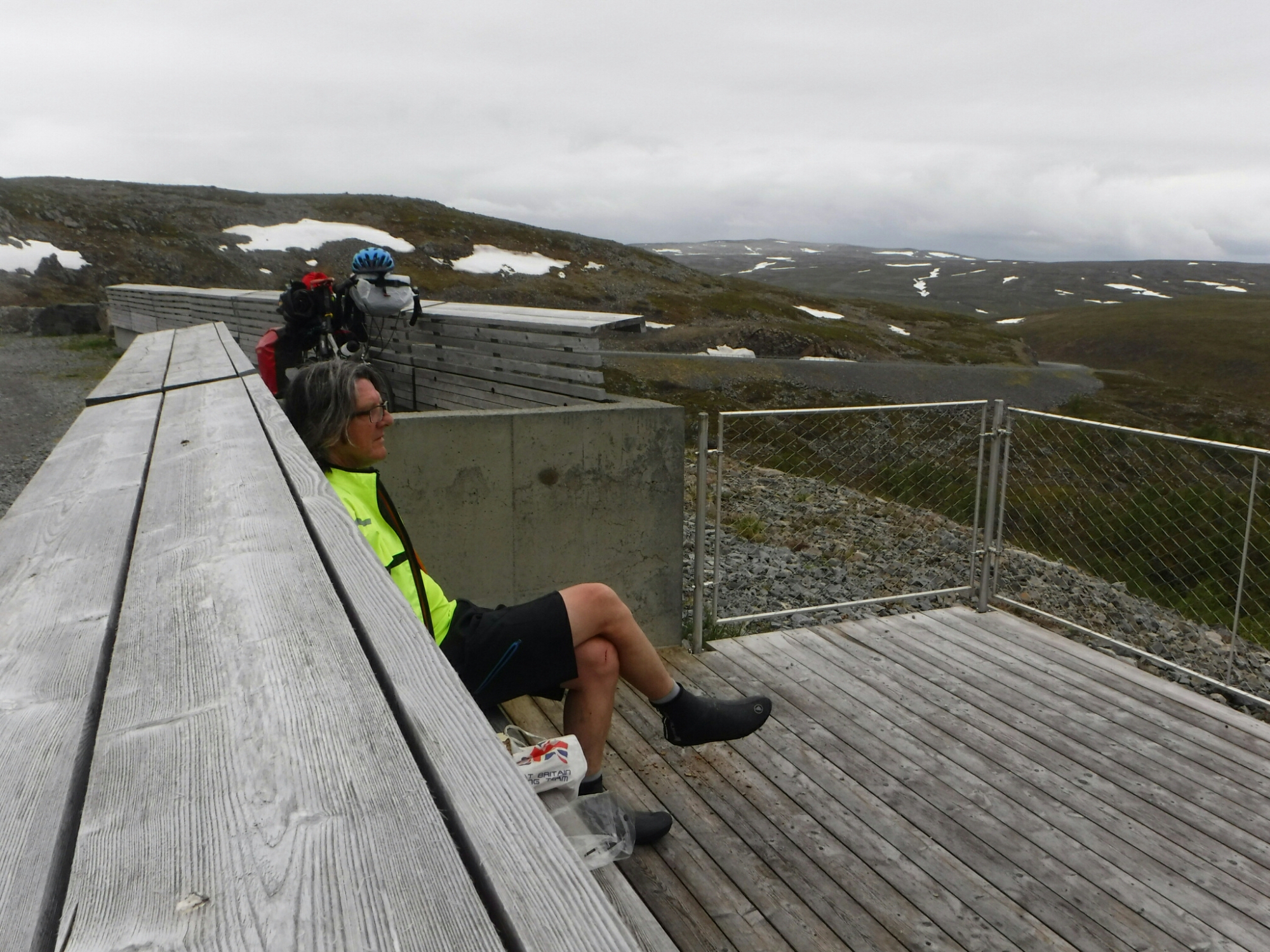 Anyway, the first part of the ride was pleasantly along the coast with some interesting villages. I stopped at an interesting church by chance, and had a good conversation with a tourist information guy (office set up in a church). He said the season didn’t start until the next day but he opened up day early as so many camper vans had been passing. I had only seen a handful, so there is a different view of busy this far north! We chatted about the easiest way to get the the Nordkin (the most northerly point), but he said it was a hard multi-day hike there and back over difficult terrain and tricky navigation. I’ll probably give it a miss. The first climb was quite challenging, but the worst was knowing I’d have to go right down to sea level and do it all again. In fact, the barren plateau on the top was the biggest challenge, many kilometres of rolling landscape still very interesting to look at it, but the wind and occasional rain shower took the edge off it.