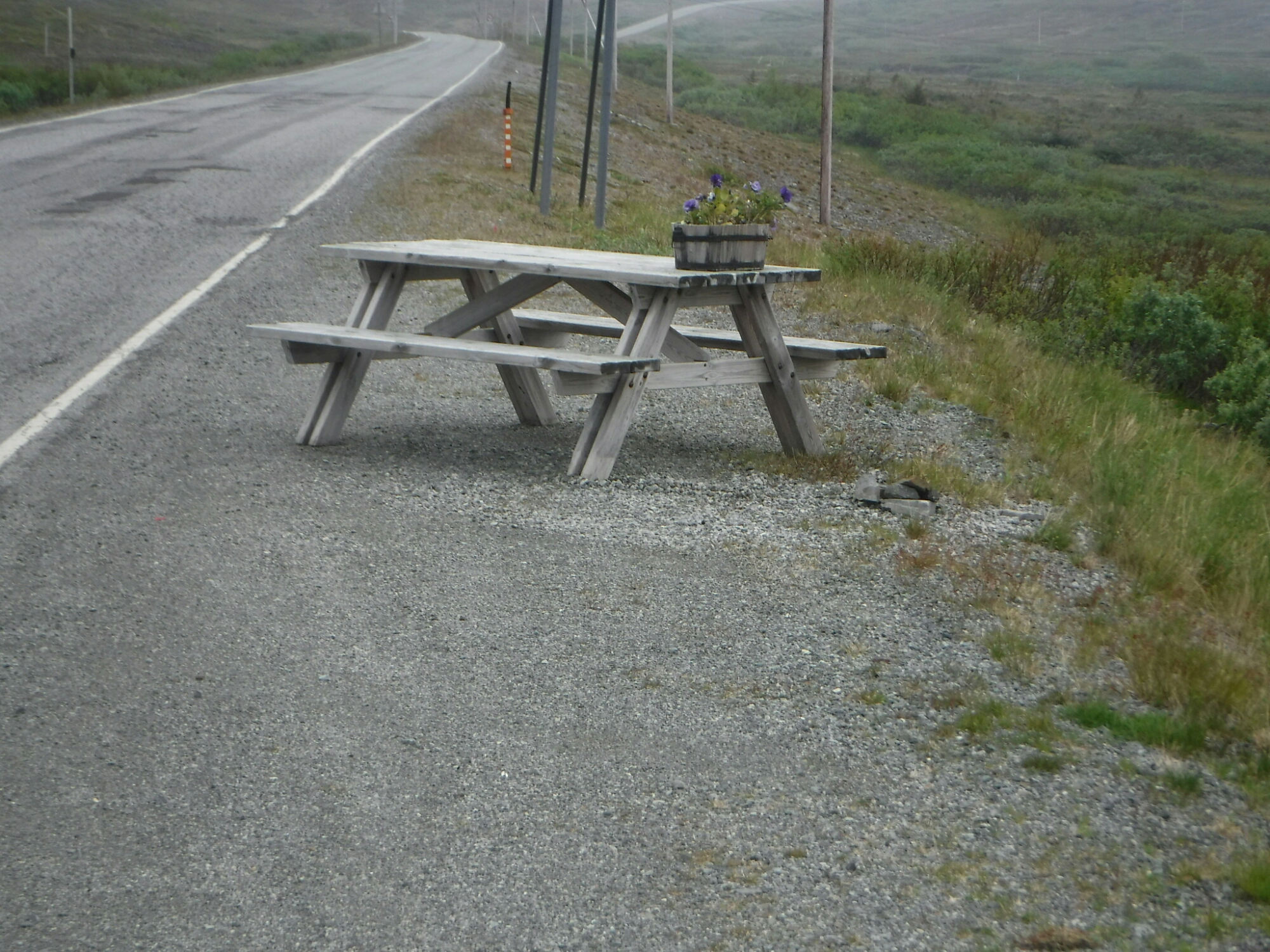 While it was very remote, there were quite a few people around. I saw a few bird watchers (or rather bird photographers stalking prey) and also a few cars parked near lakes, which I did suspect as people fishing. I now know these lakes are rich with trout, but I’m don’t know how the fish ever got there in the first place. There are still lots of reindeer about with babies (highly technical term) who seemed to prefer sitting on the snow than else where. The final downhill into Mehamn was quite nice, and the profile from Google maps was wrong, with no evidence of the final three kicks of the day, which was a nice bonus. The town welcomed me with the best picnic bench yet, decorated with flowers. I lent my bike on it briefly but I really just needed to find somewhere to sleep.