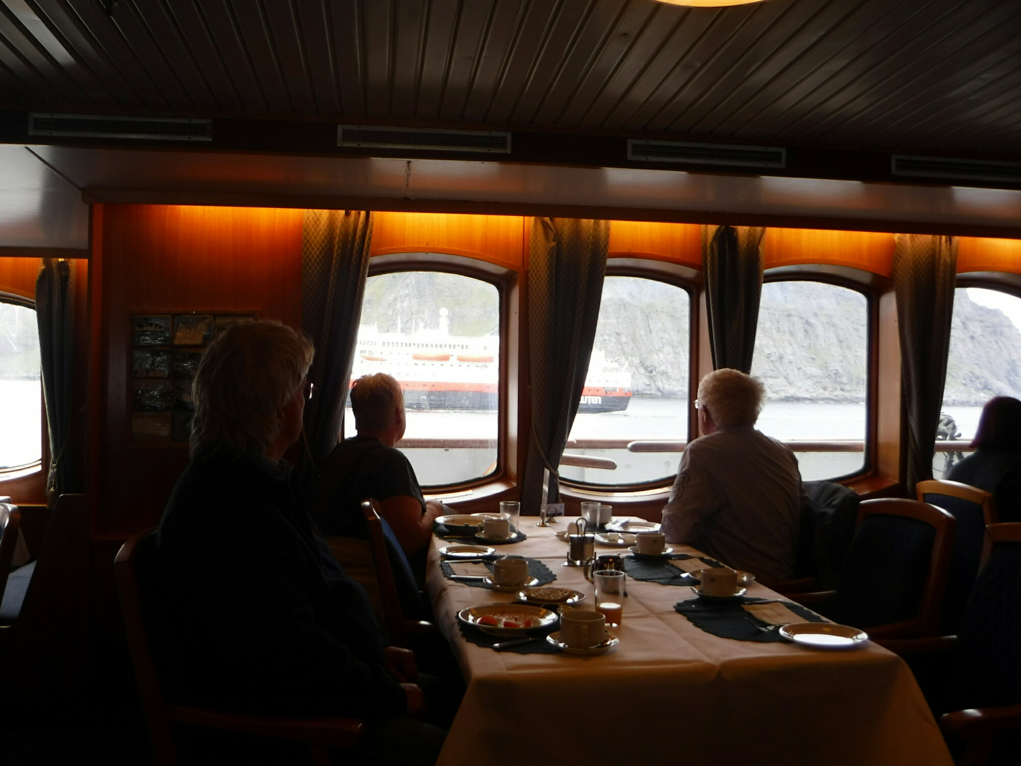 I boarded the Hurtigruten at 1 am on Saturday morning and I was due into Sortland on the Lofoten Islands at 1 pm on Sunday, so had a day and a half to occupy myself. As I had booked the cheapest cabin (without a window), I woke in total darkness (something I hadn’t experienced for weeks) and was a little confused. It turned out to be 8:00 in the morning, so went off in search of breakfast and to work out the system. The Hurtigruten has a bit of a mix of passengers with (I think) the majority taking a week-long cruise between Bergen in the south, and Kirkenes in the north next to the Russian border, or vice versa (as in this case) or even both ways for two weeks. There are others like myself using it as transport between various ports. The price included breakfast and I had treated myself to the evening dinner as an extra. Because of the cruise passengers, breakfast was a grand affair and I enjoyed multiple courses trying not to look like I have lived out of a pannier for the last week and never seen food before (with the exception of bread, cheese and pasta).