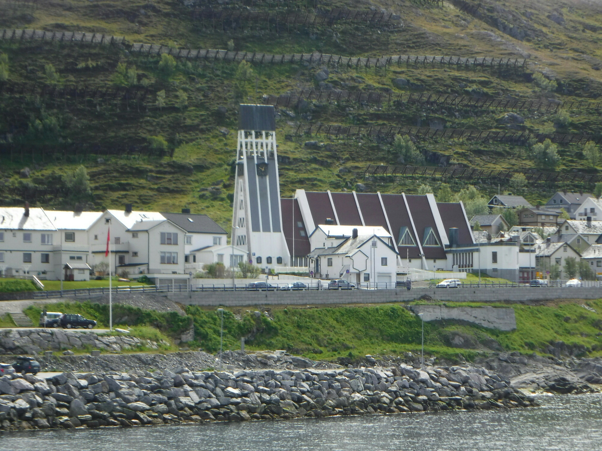 Anyway, dinner was more enthralling with good conversation with a Danish couple, and a Norwegian guy, with many subjects covered and the dinner was good. I then whiled away more hours until we docked in Tromso at 11:45pm. I was chatting to a fellow cyclist who was getting off the boat at Tromso, he had cycled to the North Cape from Belgium and was flying home from Tromso. He seemed very pleased to be going home and cited the poor weather as disillusioning him, and blowing his budget as he couldn’t camp every night. I wondered whether I would be as pleased as him to finish and go home.