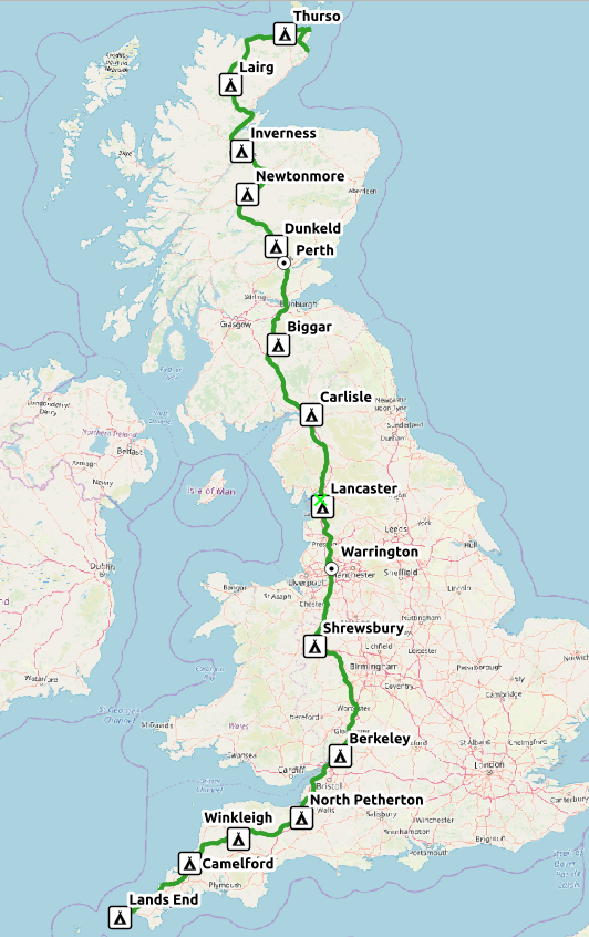 I’m at Gatwick with my bike and gear all packed, heading to Inverness, should be at John O’Groats by lunchtime tomorrow, and Lands End 19 days later. However, it all seems a bit unlikely at the moment!