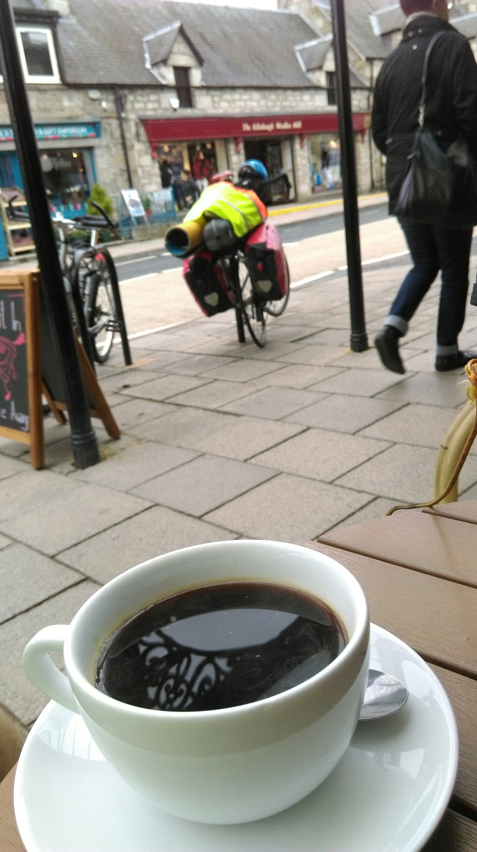 The route goes through all the towns, so I was able to stop in Pitlochry for a coffee and the cash machine. I assume Pitlochry is famous for something – fishing maybe – but it was just jammed with woollens, whiskey, kilts and outdoor shops (including a Greggs) – but its clearly a very popular place.