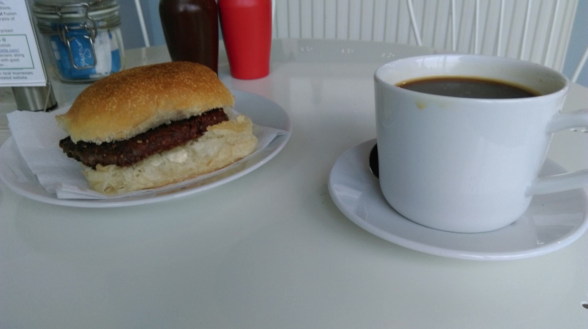 I cycled back into Biggar and picked up some supplies, including meths for my stove, and headed down the A702. The road was slightly busier that I would have liked, but all the cars and lorries gave me plenty of room. I was thinking about cutting across to the A73, which despite its name looked like a smaller road on the map. I decided to stay on my road, which proved a wise choice as I glimpsed a much busier road across the valley. I joined the North-South NCN74 at the M74 motorway in Abingdon and stopped for breakfast. Thought it might be my last chance for a square sausage, which is a Scottish delicacy. The order was duly written down on the order book as picture of a square. What I don’t know is whether the rest of the menu had pictorial representations, and it was because the chef couldn’t read. Anyway, it was nice, and consisted of a square piece of sausage meat in a roll, which explains its name.