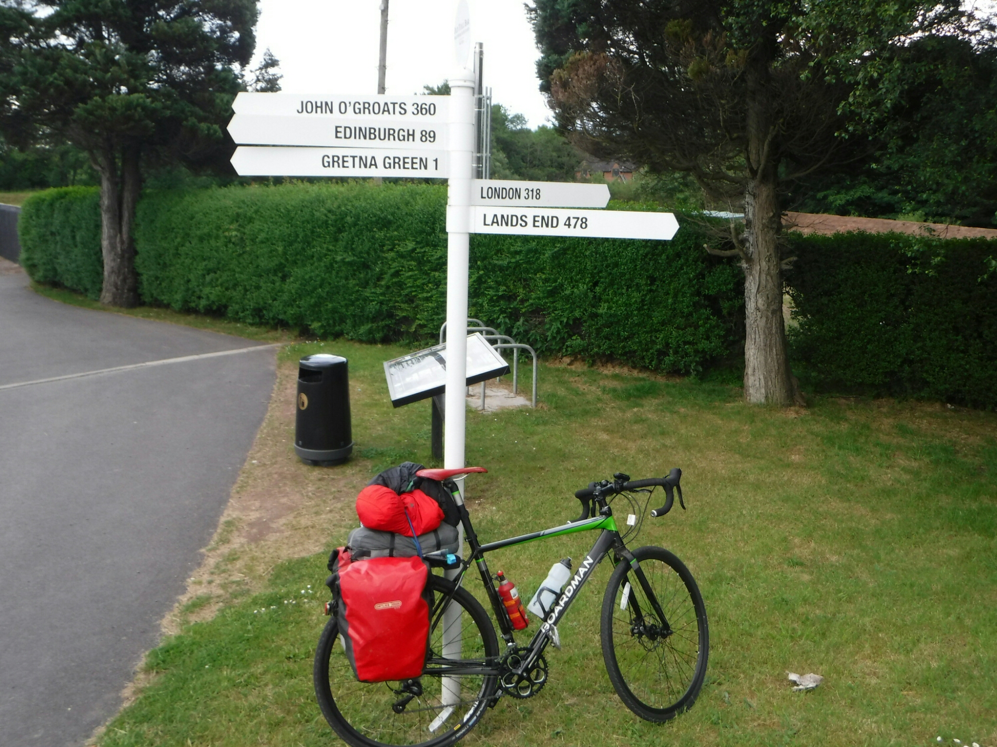 I was now on a final push to leave Scotland, and get into England. This meant cycling through Gretna Green. I have been to Gretna before and knew it was mainly set up for weddings, as there were different laws for getting married between England and Scotland. For the last few miles the cycle route took in some really nice back lanes, which was a relief from the main road style of the rest of the day. Once in the town, I cycled past some shops thinking there would be better ones further on. There weren’t, and by the time I’d reached the “Gretna Gateway Outlet” complex on the other side of town it was too late to turn back. It was going to be a dinner of rice and beans which was bought from a Mace petrol station shop (and a obviously a Swiss roll). I reached the first (or last) house in Scotland with a nice sign post – John O Groats 390 miles, London 318, Lands End 478 miles. Its closer to cycle home, than back to John O’Groats. It really demonstrates how big Scotland is. I’m getting close to halfway and only just in England