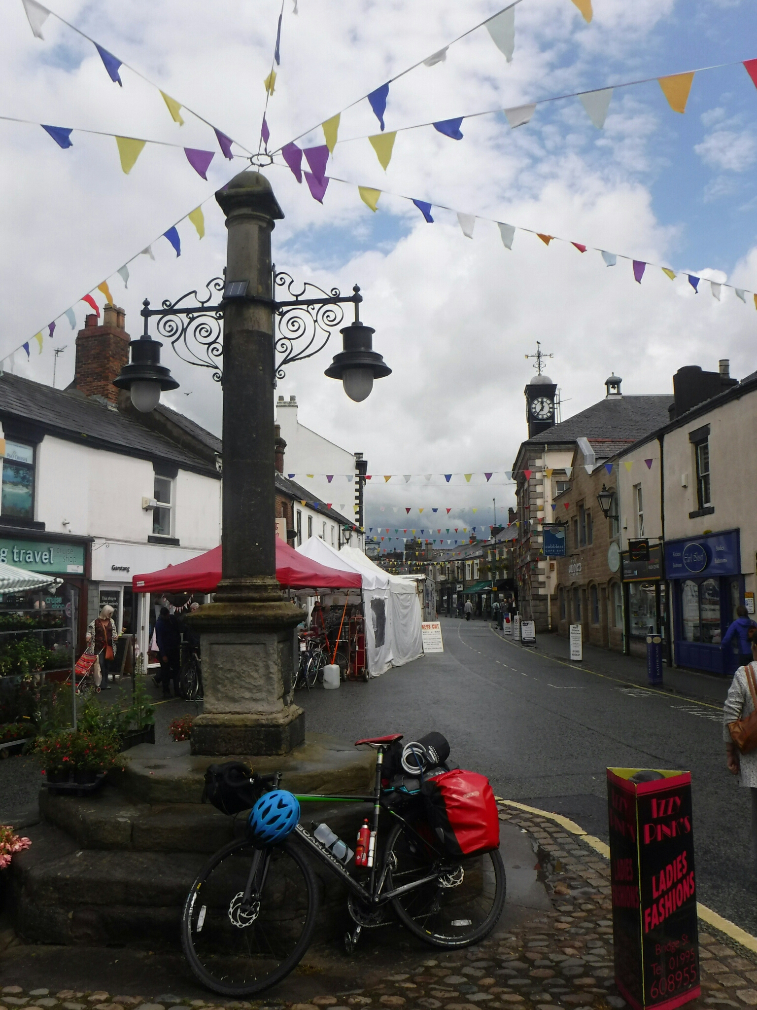 After a few lanes it was back on the A6 and I was ready to do some miles. I stopped in Garstang, which was the countries first fair trade town according to its list of attributes. I live in a fair trade town (which is good), but I must find out what it means. I went to a recent concert during fair trade week, and they were selling fair trade chocolates – which didn’t mix too well with the local beer. There must be more to it than that – cycling lets you ponder things! Garstang was a really nice town, and it was market day. I parked the bike against the town cross and had an excellent Goats Cheese quiche and salad from the shop opposite.