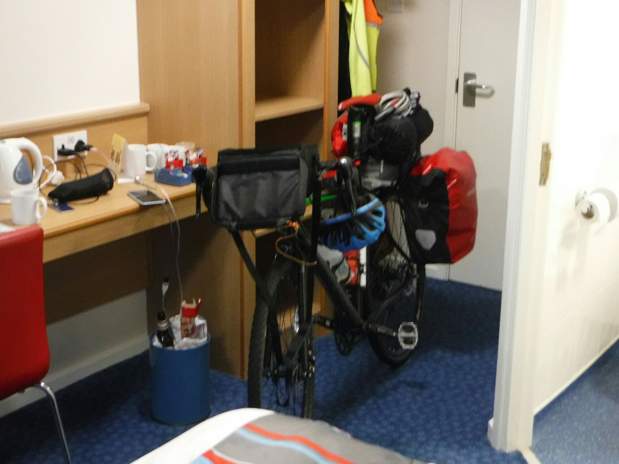 I must try and write less as its taking a long time and consumes a huge amount of my battery. This one might be quicker as a large proportion was spent head down on the A49. While I had unloaded the bike into the Travelodge bag by bag, as the bike was in the room I decided to load it up and wheel it out – less disturbance for everyone, and the receptionist didn’t bat an eye lid.