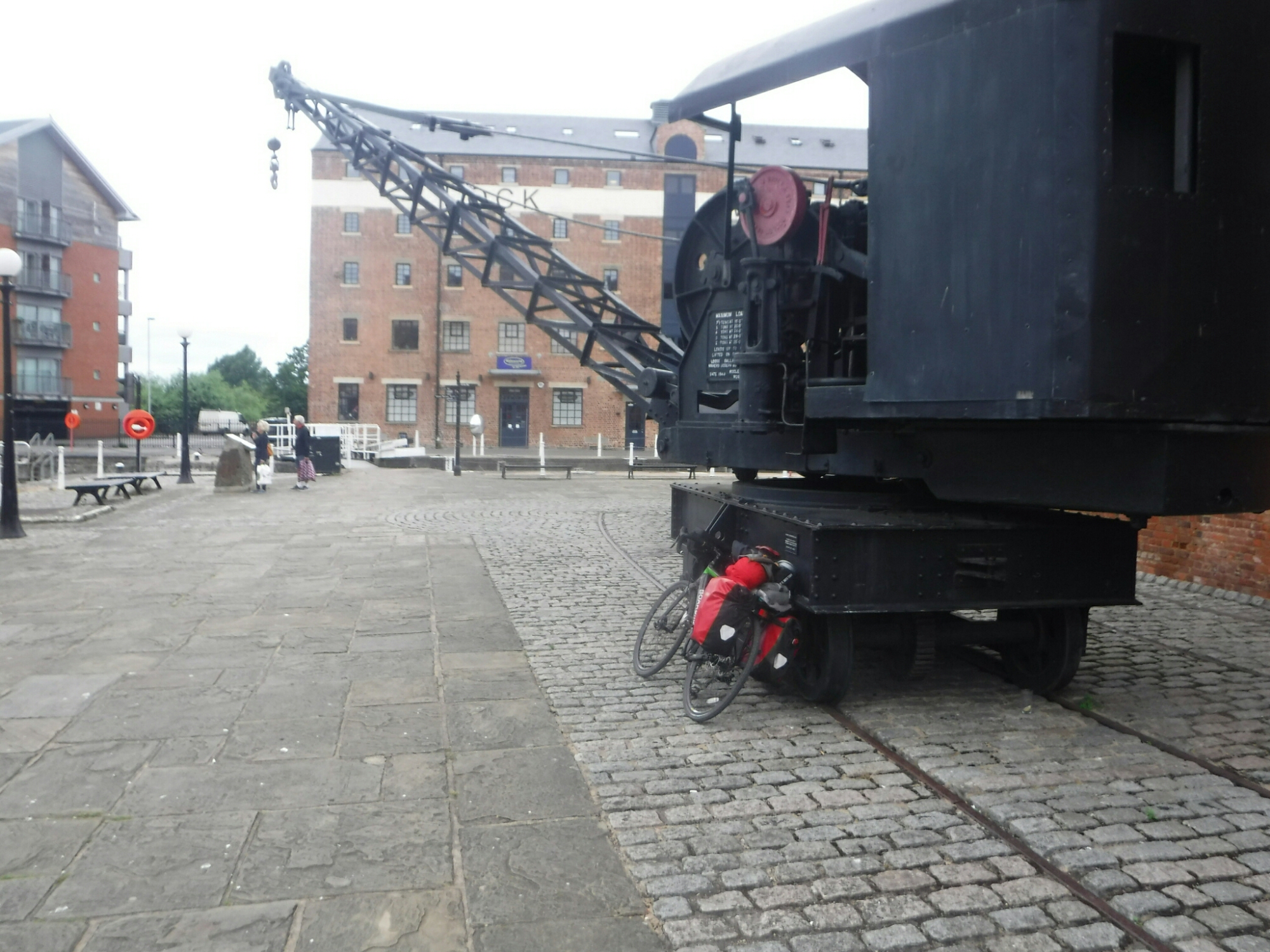 Time was creeping on and I was due to meet my friend Mick in Berkeley (a small ancient town between Gloucester and Bristol), so I got into the B4211 which pretty much took me directly into Gloucester – it was quite busy which helped me keep my speed up, the only problem was that some points of the road were exposed and the headwind was energy sapping. Jumped off the main road onto the cycleways into town, and a couple stopped as I was looking at the signposts – they advised to go direct to the Docks, but there were some gates. I headed that way, as the gates couldn’t be worse than on the Wigan canals, they weren’t or I’m more experienced.