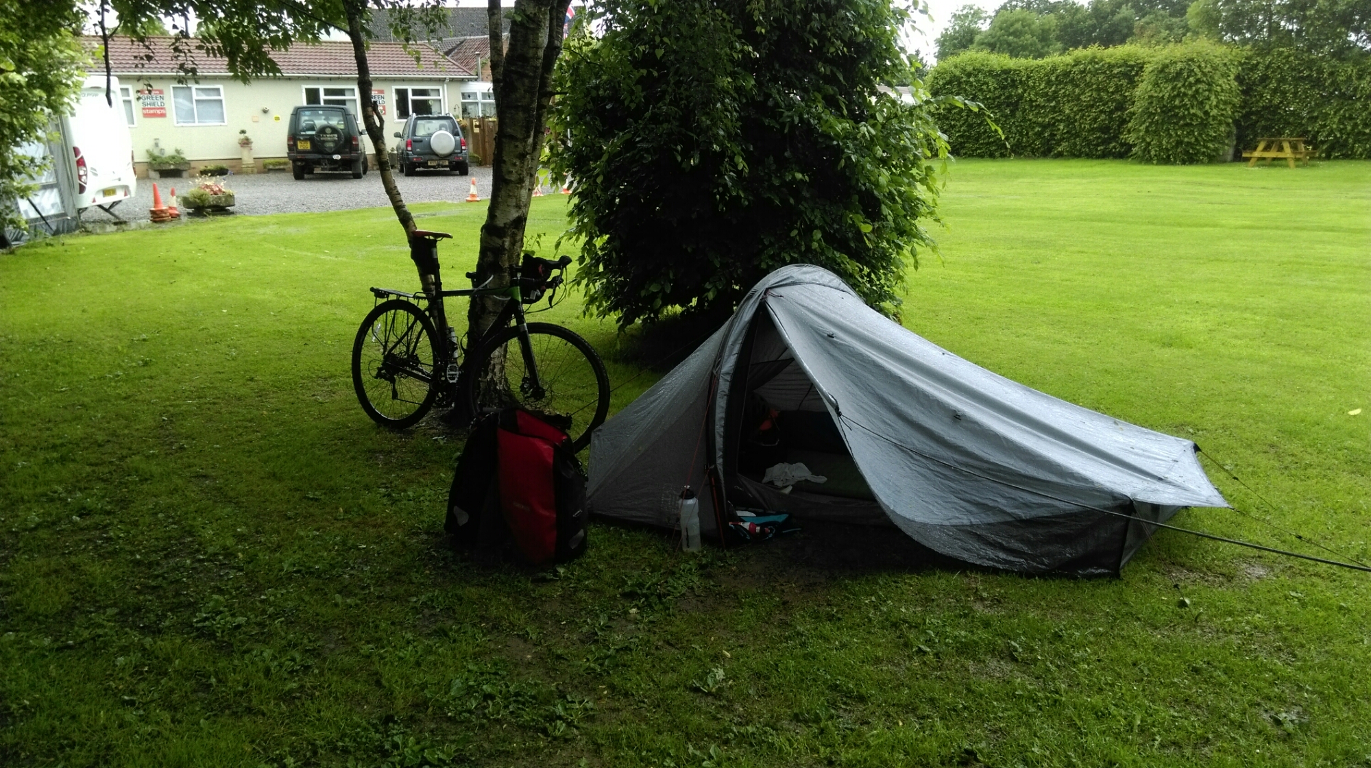 Arrived at the campsite at 5:30 (the allotted time for me to be ready to go) and Mick had just arrived and was waiting outside. The campsite was like a fortress, with a high level of security against travellers. Very friendly campsite guardian chatted to me and Mick, while I pitched the tent in the rain. I grabbed a shower and we headed to the pub for dinner, it was nice to have a long conversation for once. The site had a good washing machine and crucially Mick had brought me washing powder, so after the pub I washed pretty much everything I’d brought with me, and got it all dry – despite it continuing to rain and the campsite getting boggier and boggier. There was a socket in the laundry, and I plugged in my big power pack – unfortunately it didn’t charge overnight (not sure why), leaving me low on battery levels – any why I’m sitting in Taunton Asda typing this!.