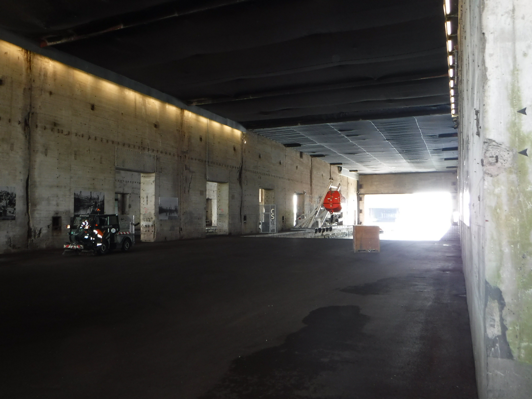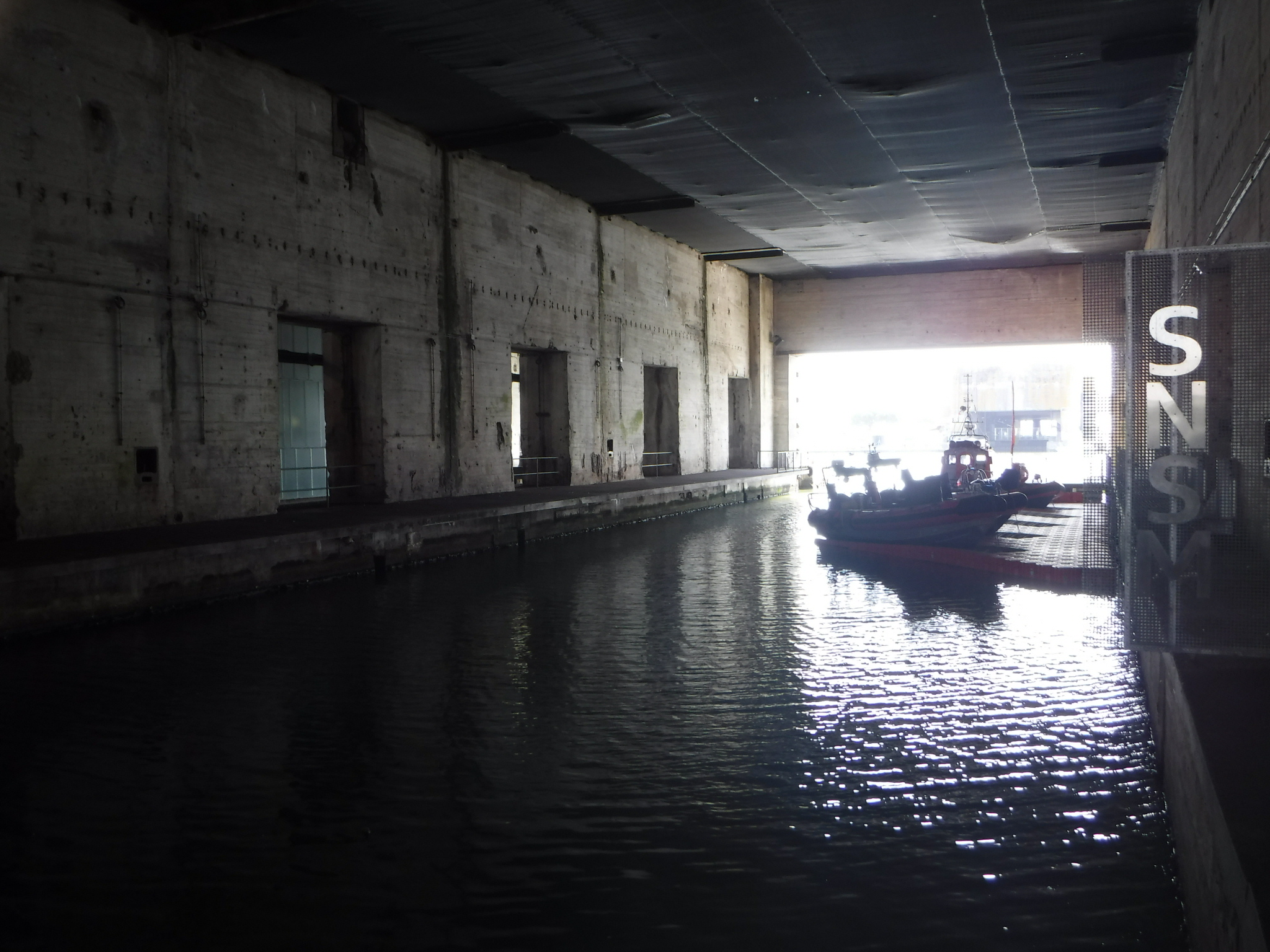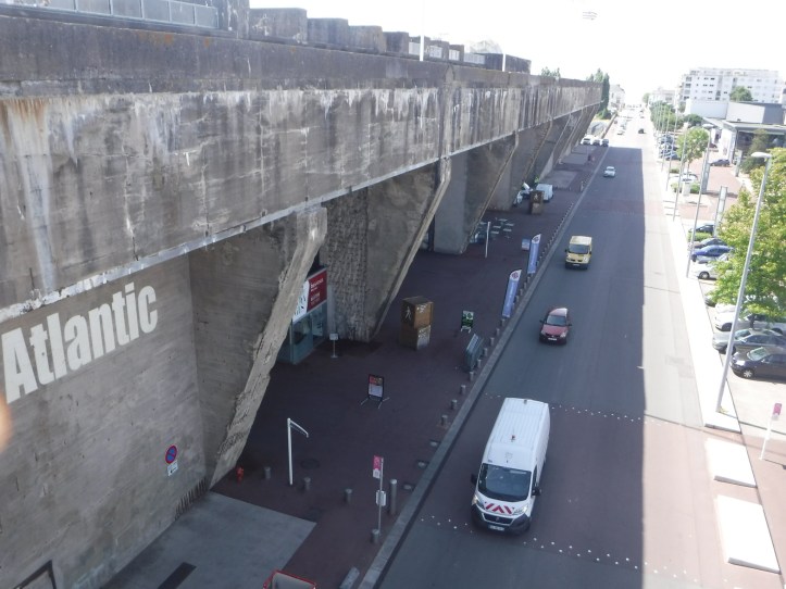 Well, last night when the gardener said €10 and sort it out in the morning, it turned out it was high season “Special Offer” €24! A round of futile discussions in our own languages left me €14 down, to be fair it did say €24 on the gate – had the gardener or I been bothered to look. I’m monitoring prices now, but it’s the problem with a beach resort wanting to pack each pitch (but as it was 80% empty). I set off through typical seaside suburbs and eventually hit the St Nazaire seafront, to be greeted by a massive statue in the sea (something to do about balancing on ducks). My initial target, and the purpose of my visit was around the corner. You can’t miss the giant concrete slab sided Submarine Pens. Very impressive, but leaving an overwhelming feeling of fear, both of the people working in the pens, and the people in ships in the Atlantic Ocean. The thickness of the concrete shows the bombing force that they were expecting, the subs sailing out into the Atlantic silently sink anything they came across. A definite lose – lose situation, but I’ll have to watch “Das Boot” again. The city is trying to use them for a museum on Atlantic Liners, and other spaces but the forest on the roof the most innovative.