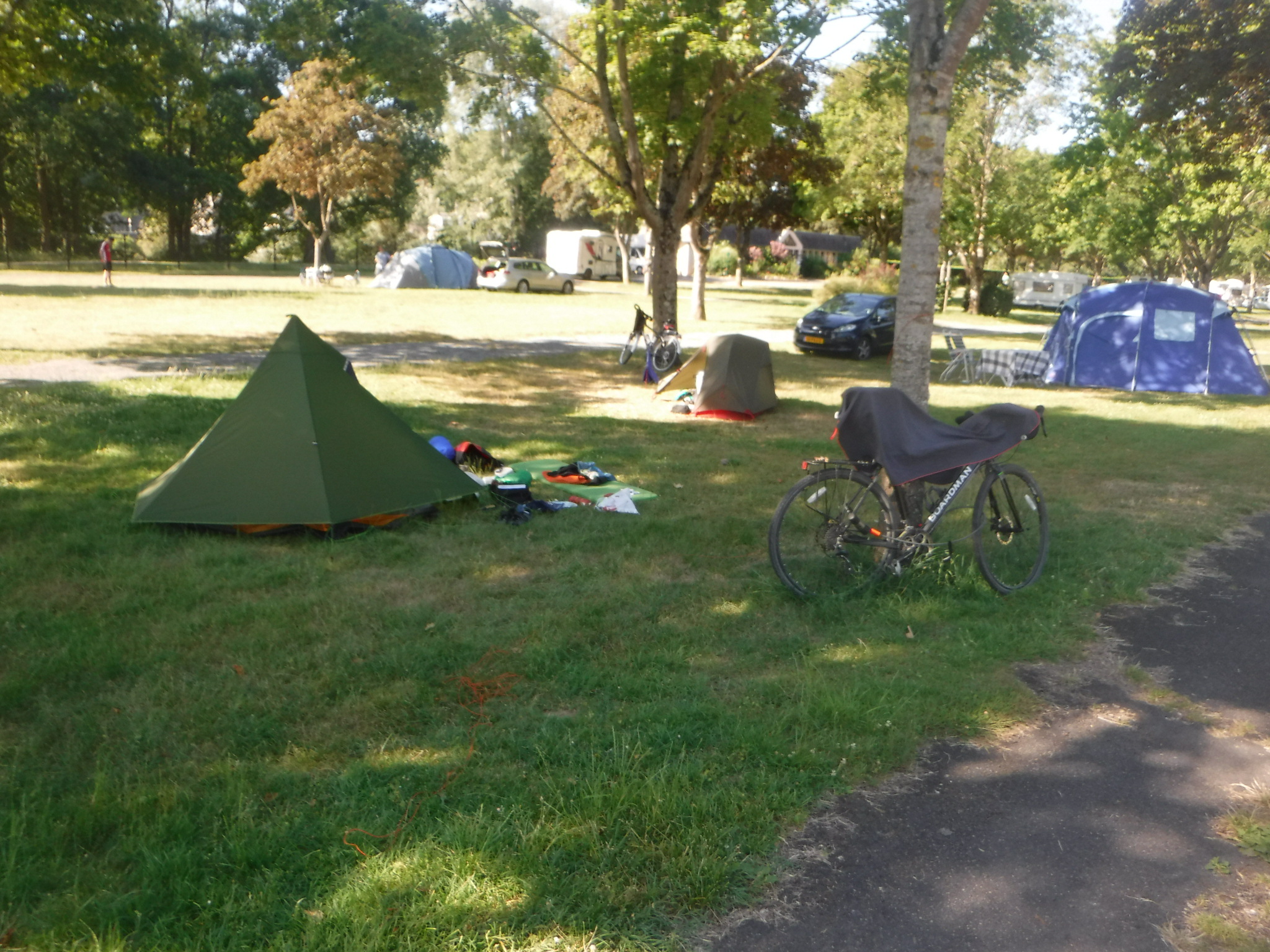 I slept really well, despite being woken in the night by high winds, which left me worried about pitching the tent so high to aid ventilation. I quickly tightened the guys and made sure nothing could blow around in the porch. While cooking breakfast I noticed “the couple” waving at me from some strange hire tent on legs – the chances of us hitting the same site are a bit spooky. I’d first spotted then just after Ancenis, when I popped out of a mountain bike track in front of them three days before, and something like 180 km. Anyway after they left I haven’t seen them (today). There was one other bike parked around the bike hut, and I’d been chatting to the British owner yesterday. He was on his fourth day (of a month tour to Spain), never been on a cycle tour before and only ever really cycled to work and back. He had just started really enjoying his trip. Overcoming the fears about the bike breaking or finding it too hard. I remembered four days into my Finish trip from Inari to Utsjoki when I spent the whole day overcome by the whole experience (in a good way).