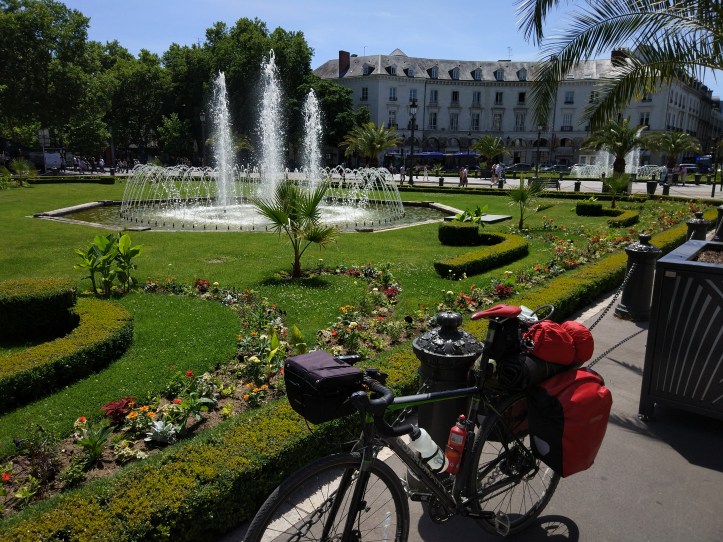 The route started to get near familiar territory, first with Langeais, where there wasn’t a good view of the chateaux from the south bank, but I didn’t cross over the river to see it as I knew there were more chateaux to come. Next was Vilandry, it was quite busy and I know from experience the gardens are fantastic. I found a bench outside in the shade, watched the tourists and ate my previously bought sandwich. The route then headed into Tours, the path lead through a mini golf course and into a park. The park was just a ribbon of green which seems to follow a river, but I thought it had a really nice feel. It had many types of gardens and was being used by many varied groups of people, including evidence of a recent colour run. The path popped me out right by the Tours open air swimming pool. I’ve visited it before and its a lovely pool, I was very tempted as it was another hot day, but with 35km still to do I decided to push on. The last few times I have visited Tours, the whole of the town had been a construction site with a tram being built. It was really good to see the trams working – and looking unusual in their chrome plate livery.