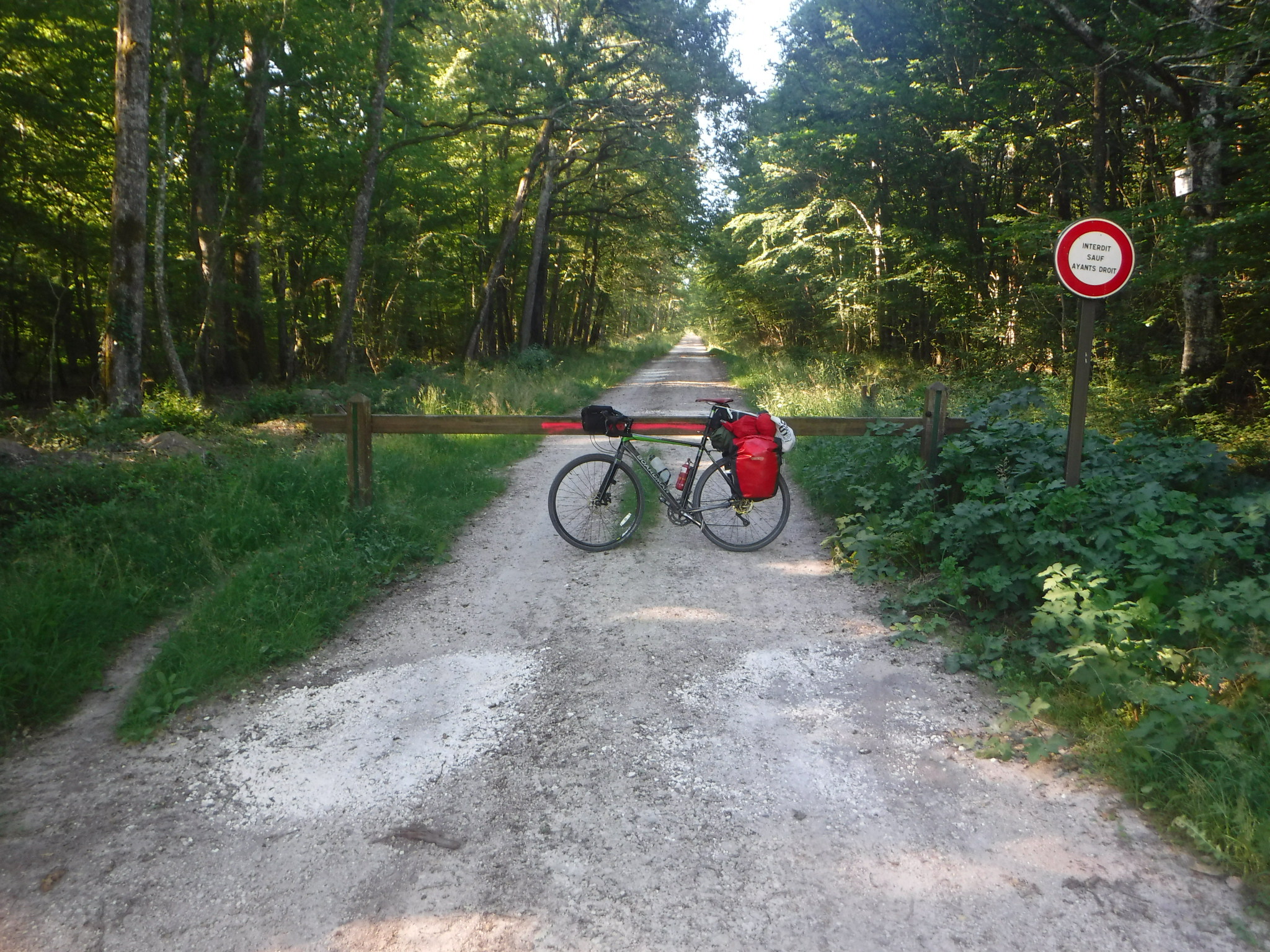 Eventually got onto some really nice quiet lanes which took me to Ingrannes, I was left puzzled at one sign, but elected for the shorter route, as I should get enough exercise later in the day. Shortly after this I took a gamble following Google Maps, there was an excellent road/path straight across the Orleans Forest. The road had a name Route le Doulchamp, but a barrier across and a sign something to do with “rights” left me with some doubts. However there was no signal to Google the sign, so I pressed on (I always think the hi-viz helps in these situations). Anyway a it was a really good run and well worth taking.