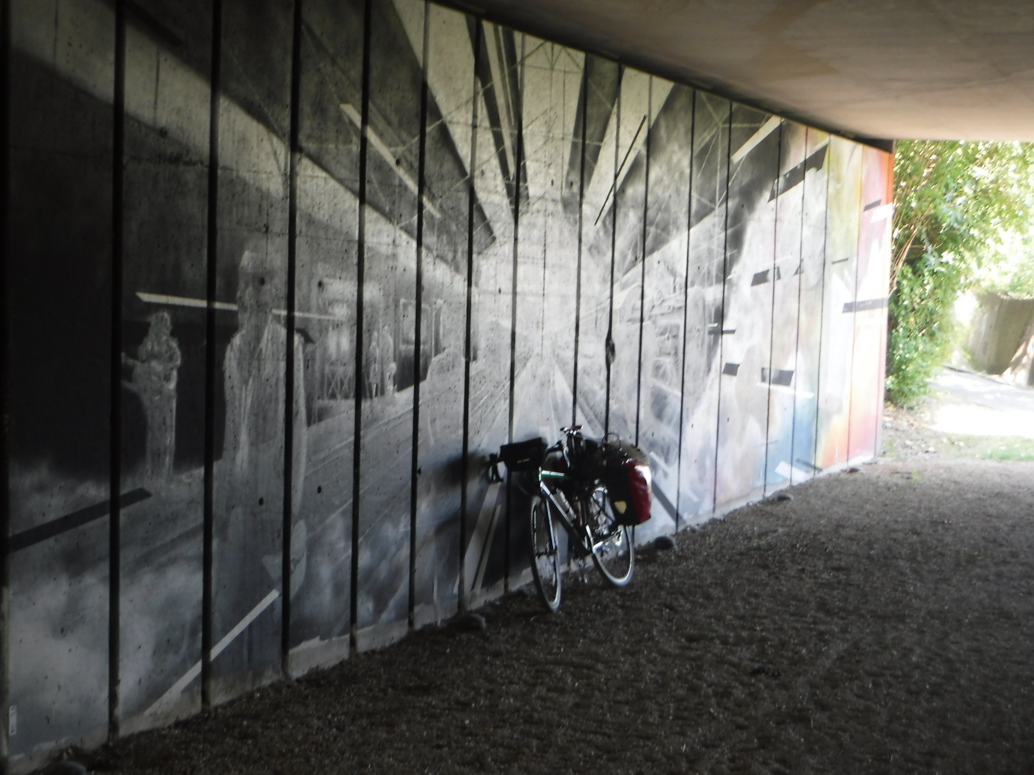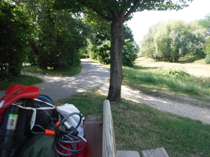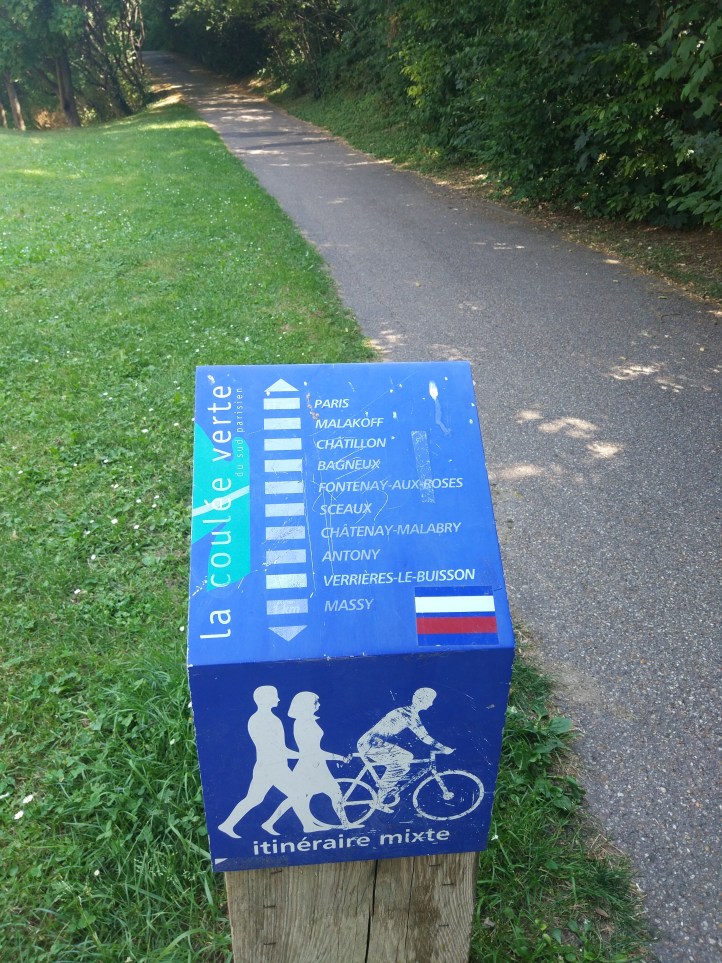 When I came out, the roads seemed quieter and there were less bike lanes to hamper progress. I started making good time. I kept thinking I would see the Effiel Tower any moment, but the map told the truth, it was still over 30km away. The cycle lanes were very mixed with the biggest problem picking up a new one at a junction, or deciding quickly that there wasn’t going to be one and head back on the road. Only then to find yourself in a narrow bit of road with a HGV behind, and you notice a two way cycleway on the opposite side of the road. It was infuriating. I eventually reached Massy, where I knew of that the Voie Verte started which ran right into Paris – popping out near Montparnasse. It’s a brilliant bit of joined up Green space, full of office workers jogging, walkers and cyclists commuting. It completely invisibly cut through the suburbs, under railways, over motorways – some bits are better than others, but on the whole brilliant (but quite slow to cycle on, with some steep hills – on one, an electric wheelchair passed me!).