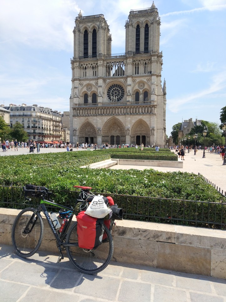 Once into Paris itself, the cycle lane was supposed to take me to Notre Dame, but for that to work well – it really needs some signs (I expect the roads ministry are monitoring this blog and things will improve in the future). Instead it’s just random, and it’s easier to stick in the bus lanes (cycles & taxis), rather than try to spot a cycle lane in the middle of the road, going in the opposite direction to the traffic! In essence, the cycle lanes are too hard to follow unless you know them, I expect its fine for commuters . That said, the cars and buses were very tolerant, and pedestrians jumped out the way when me and my fully loaded bike came barreling at them at 30 kph. I took some pictures outside Notre Dame, (as it was no cycling inside). Then took the Rive Gauche (southern bank in Loire terms) round to the Effiel Tower. It was teeming with tourists and a very high police and military presence, with all of the area under the tower fenced off. I had some lunch (which I bought from the first supermarket after the Voie Verte) – anticipating higher prices in the centre and being aware of the risk of leaving a fully loaded bike outside a shop with the high security. In case I haven’t said it was hotter than ever!