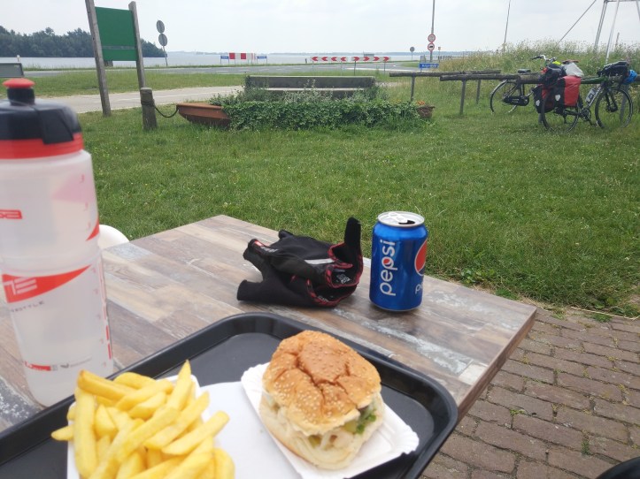 It being Sunday and everything was shut, but loads of people on their bikes or walking – and all sharing the path with no problems (the walkers are walking towards you on your side – all real easy with no surprises. Maybe only 2 dog walkers with their backs to me in 100km – it seems a mystery in the UK). Grabbed a burger at a lunch stop (one of many, my supplies are lasting) knowing that getting food would be difficult.