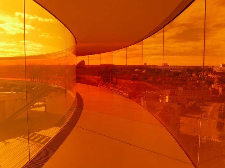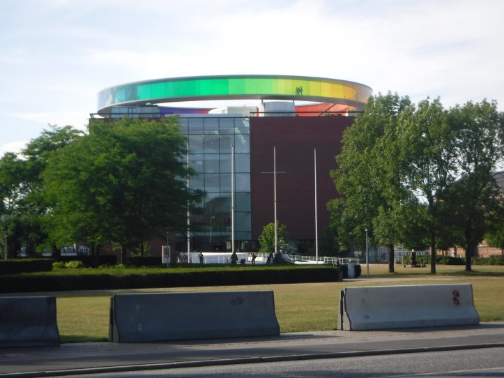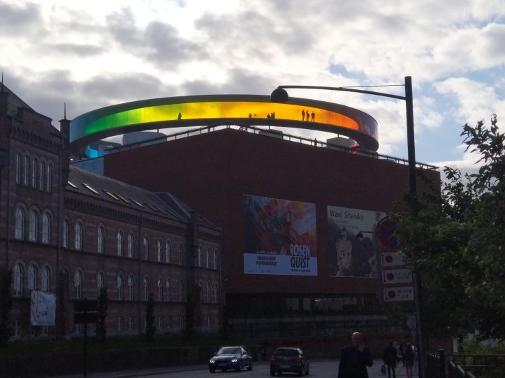 The reason for coming to Aarhus was to visit the ARoS art gallery, which has an amazing Rainbow Panoramic Walkway on the rooftop. I wasn’t going to let all the troubles of the day spoil it, so I cycled over to the museum (initially down a big hill before realising the entrance was at the top). Two cycling observations, one cycle lane had a bike counter – in days over 3000 today, and in years – a really cool idea, and hills. I’ve not been up a hill in a week, but felt strong and stayed on the big chainring – although I’m not sure how long that will last!