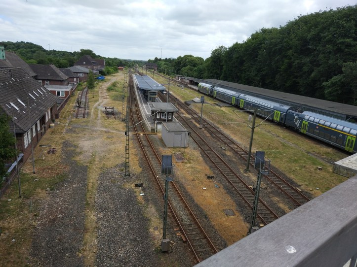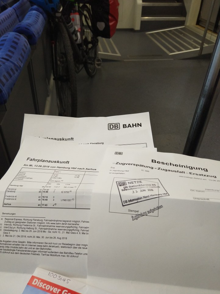 I was happily waiting for the super train to whisk me to Denmark in 5 hours, had just enough Euros to visit the trains Bistro bar, when I noticed a tiny “Fait Aus” in the corner of the sign. Googling didn’t find anything (but I now know it’s shorthand for we apologise). A check of my DB app showed all stops cancelled as far as the border – help. Got into a very quick queue (unlike yesterday), and the lady confirmed it was cancelled, said it might be tricky with a bike, and printed me of a number of choices on the regional trains – and I think most importantly an official note that my train had been cancelled (and I’m sure also said that anyone must avail the bearer with all possible assistance).