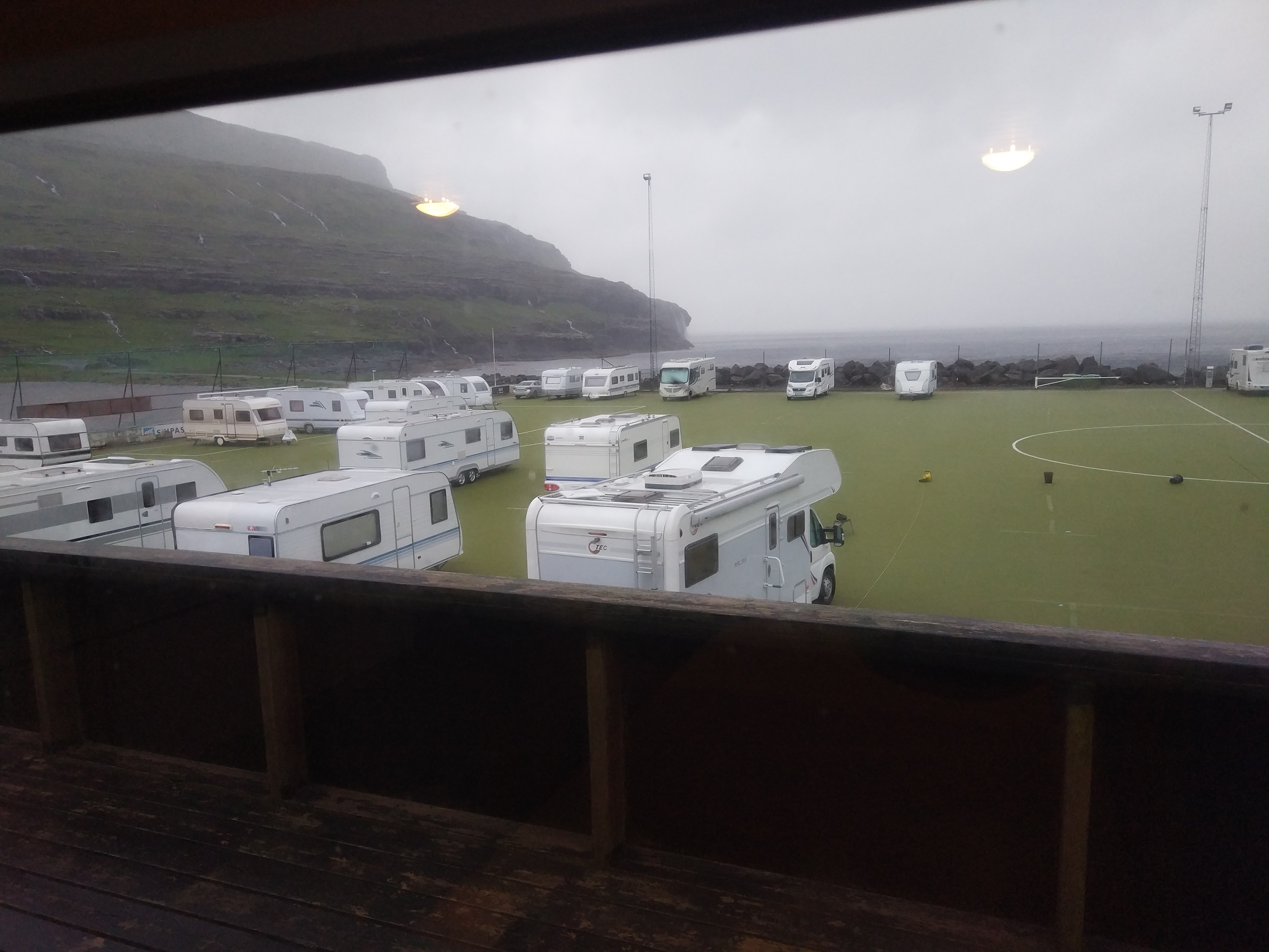 My option was sleeping in the football club changing rooms, I just rolled out my inflatable mattress on the cold concrete floor (except it appeared to be heated) and slept like a log. During, the previous, relaxing evening, with the Danish couple (in a van), and the German guy (fellow camper), two Finns (also camping, who had been camping at Torshavn the previous night) arrived. The storm was not really abating, you thought it might then a few big gusts would hit. The emergency services visited periodically to look at the caravans, as most were unoccupied. There was rumours that one was blown sideways, so it was a big issue. None of us campers attempted to put up a tent and we all stayed in the building. As a result I had a very good nights sleep without worrying about the tent.