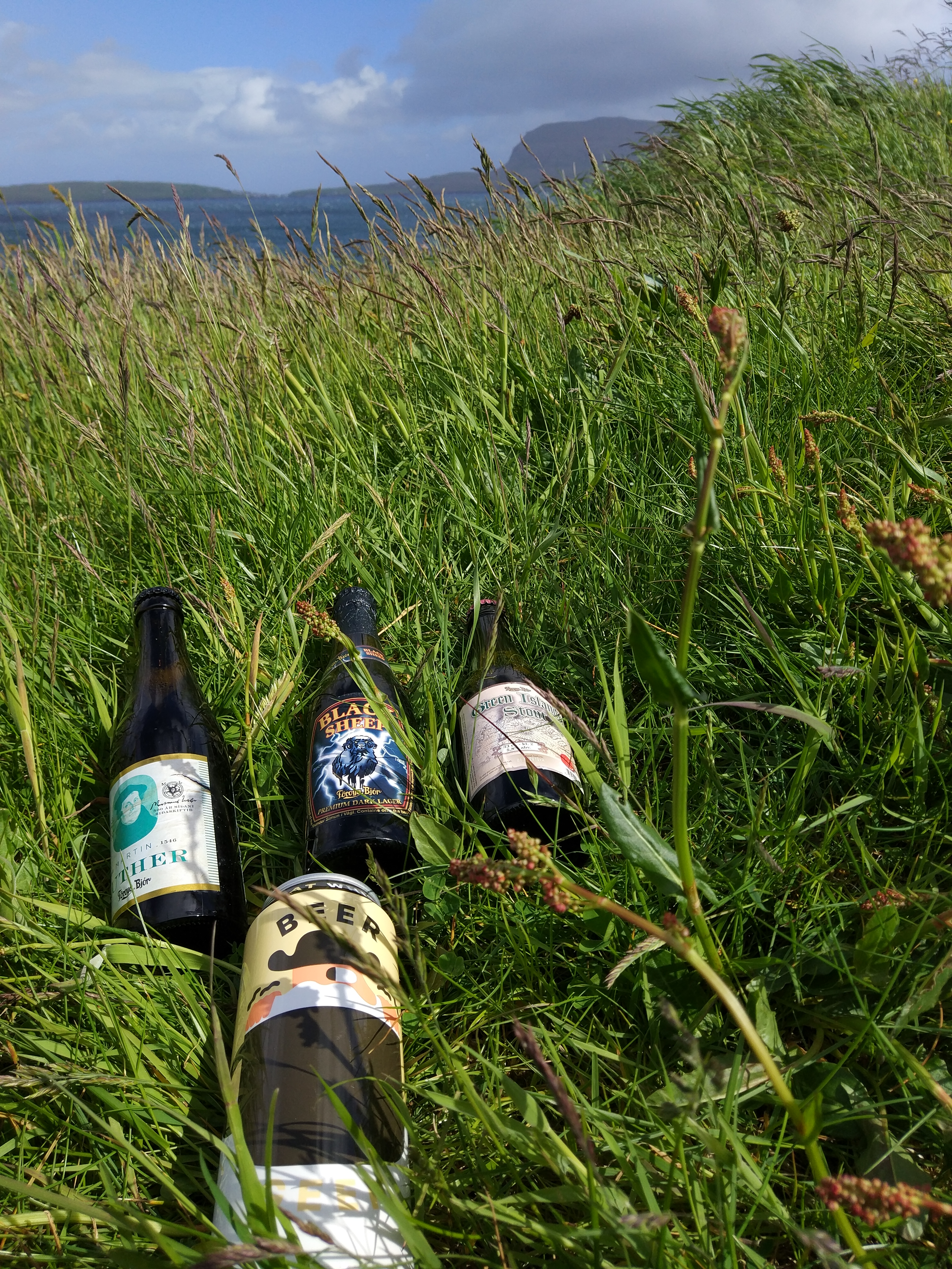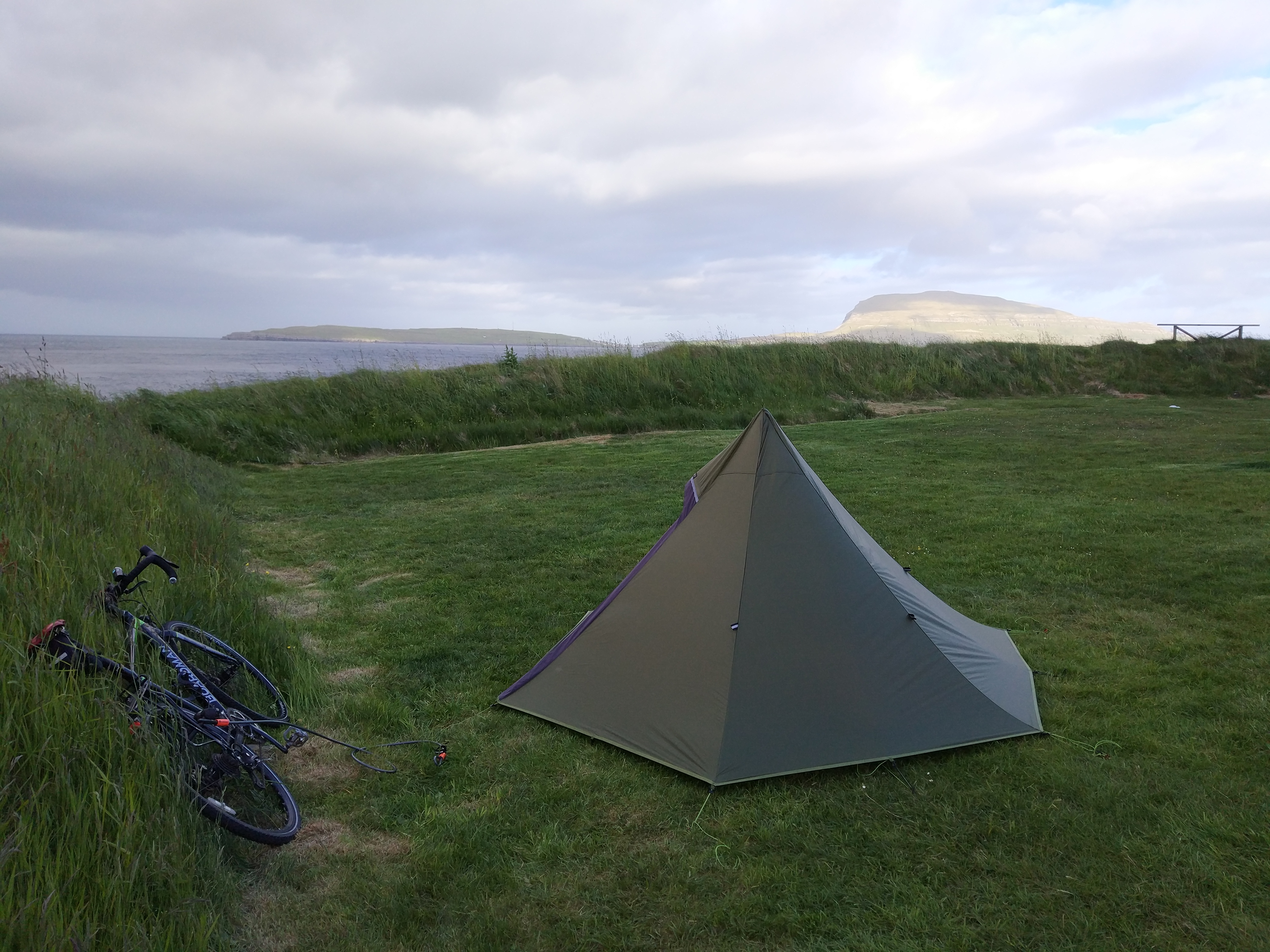 Back in Torshavn, it was sunny but still windy. I warmed up a bit in the coach station, where my bike blew over outside! I decided to go shopping for food, buy some Faroese beer and pitch at the Torshavn campsite. The first shop I tried was just a convenience store, then a slightly bigger supermarket where I got all the food but no beer. I asked the assistant, who said I needed to go to a special shop, which turned out to be up a big hill, but at least in the same direction as the campsite. True to her word, the shop was full of wine, beer and spirits, and reminded me of Waitrose. I got a good selection of local beer, and cycled back to the site, only to be greeted by the Danish couple who had come to see the art gallery, and just scoping out the site. They were heading back to Eiði in lieu of any other plan. I couldn’t squeeze my tent onto the sheltered area so took a brave decision to pitch nearer the sea.