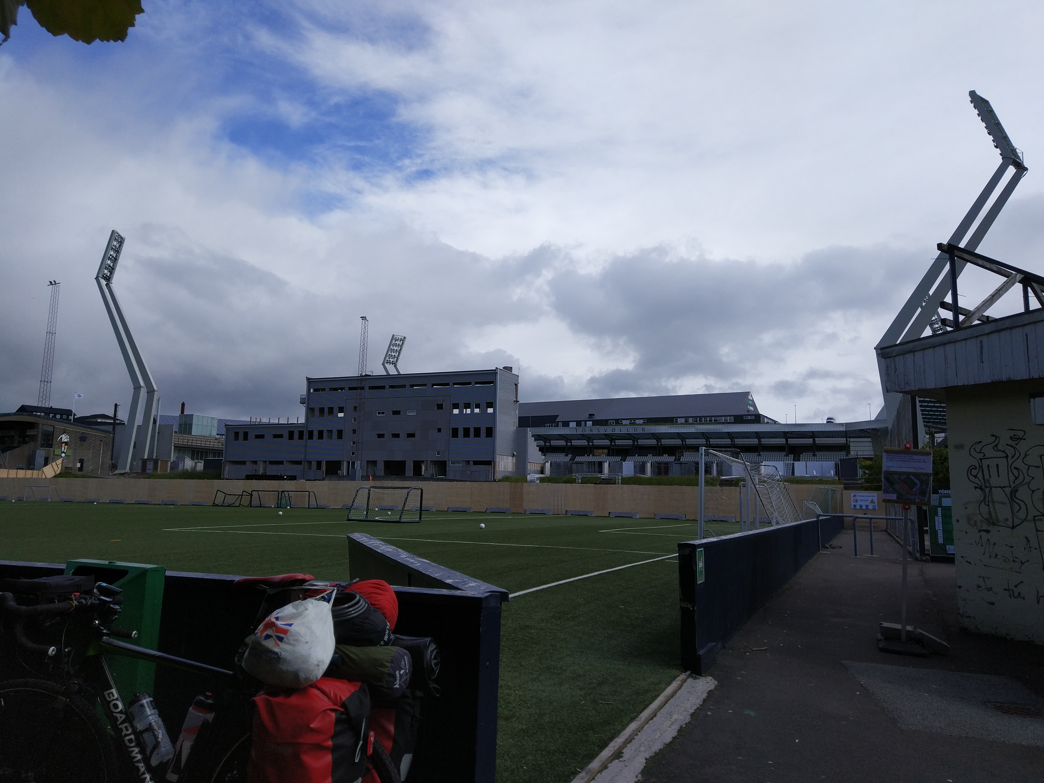 It was really nice cycling through Torshavn without wind or rain, and I was able to stop to photograph things. The first stop was the National Football Stadium, the Faroese are clearly football mad – there are three pitches and a couple of clubs just in Torshavn. While struggling over the fateful mountain a few days ago, the first sign of civilisation I saw in Eidi was the football stadium, and then the campsite was on an AstroTurf pitch in the town as well. At least two pitches for a town population of 669 (according to Wikipedia)!