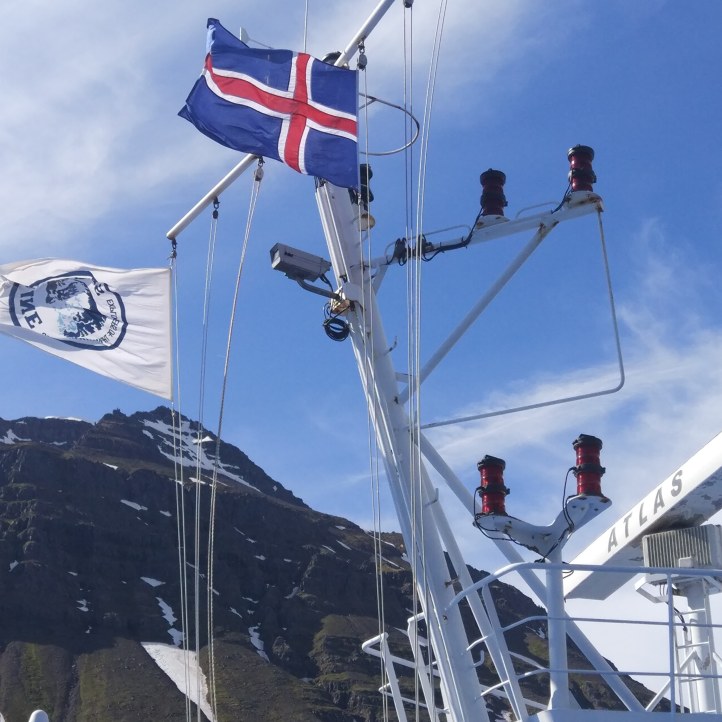 Iceland gradually came into view, but I stayed inside until we started into the fjord as I expected it to be cold and windy. It was a real surprise when I did get on deck to find it sunny and warm. The mountains with patches of snow were magnificent.