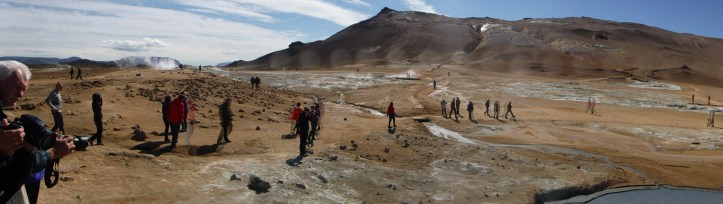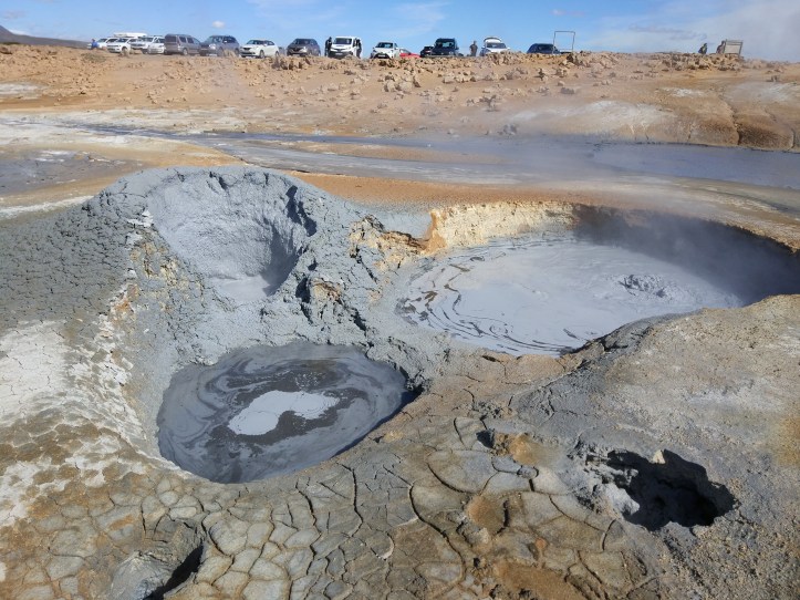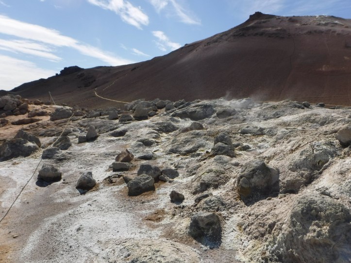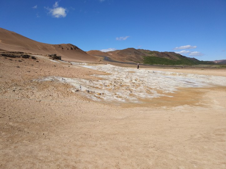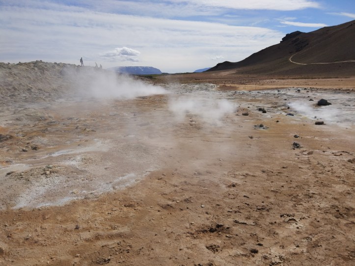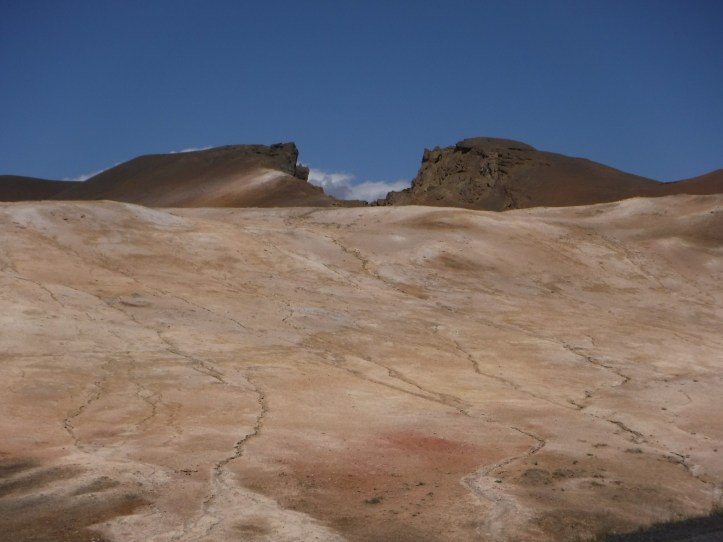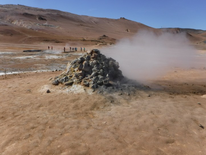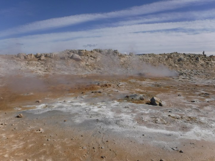 I cycled back to see the thermal area I had seen from the bus, and to go to Myvatn hot springs which was on my itinary. It was good riding the unloaded bike, and the wind was behind me (confirming my fears of a headwind if I’d cycled). I climbed up over the mountain to Namaskard, a thermal area where the boiling mud and steam are at the surface. It is a really striking place, the colours where the minerals have come out of the ground, the various noises of the mud gurgling and all in a lunar landscape. I got too close to one stack and it steamed all my glasses up.