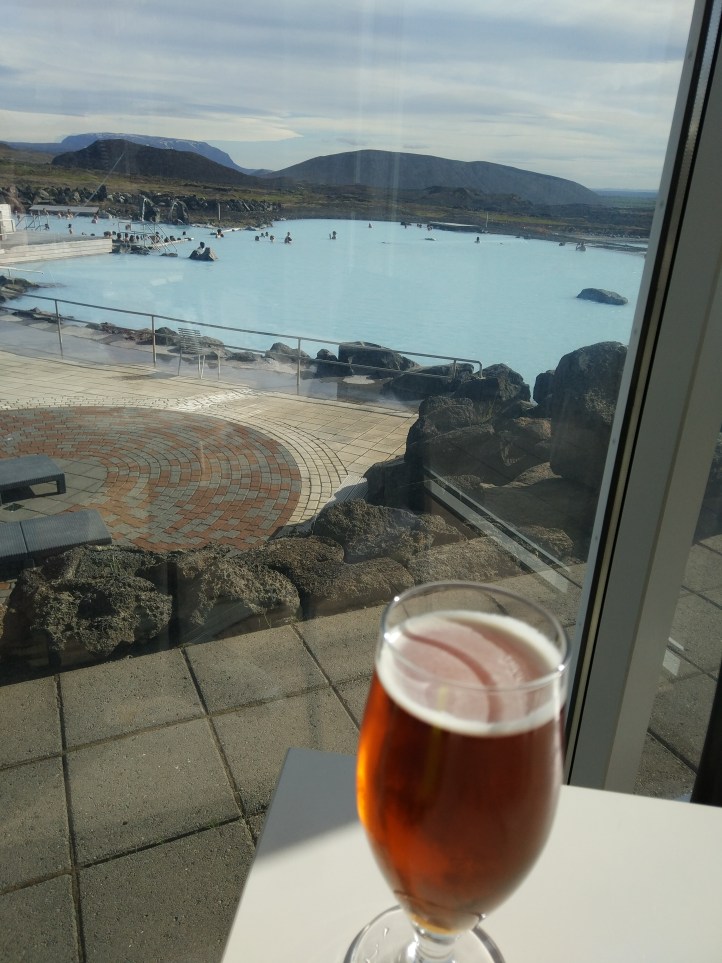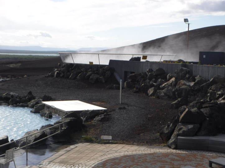 I turned off into the Myvatn Natural Pool, not so natural as it turns out, but very, very nice. Obviously it was quite expensive, £30 (with a discount because the wind had cooled the pools by 2°) but really nice with two big pools. The cooler one (but still hot) was empty enough to swim in. They have rocks all around and a gravel bottom. There was a small pool with water at 41°. All very refreshing, and even better when I polished it off with a beer (you could drink in the pool, and the lifeguards would bring the beers), but I opted for dry land.