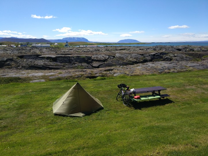 Well, today is when my cycling goes to pot! My research had located the bus stop right at the entrance to the campsite, and if my bike would fit in, it would whisk me the 165km to Myvatn in two hours, rather two days on the Ring road. Which was very appealing! I got up at six (it still seemed way too light), and made use of the facilities while it was quiet. I had my normal breakfast, coffee and porridge, with honey and banana chips. I make coffee using an aeropress, really good coffee, but I’m running low on filter papers – which is crazy as they don’t weigh anything. I think I was trying to be too ultra light! Despite getting up early, I only just made the bus at 9:09. This was mainly because I started chatted to the Belgian guy, and gave him my A3 colour copies of the cycling map – as I had the real thing!