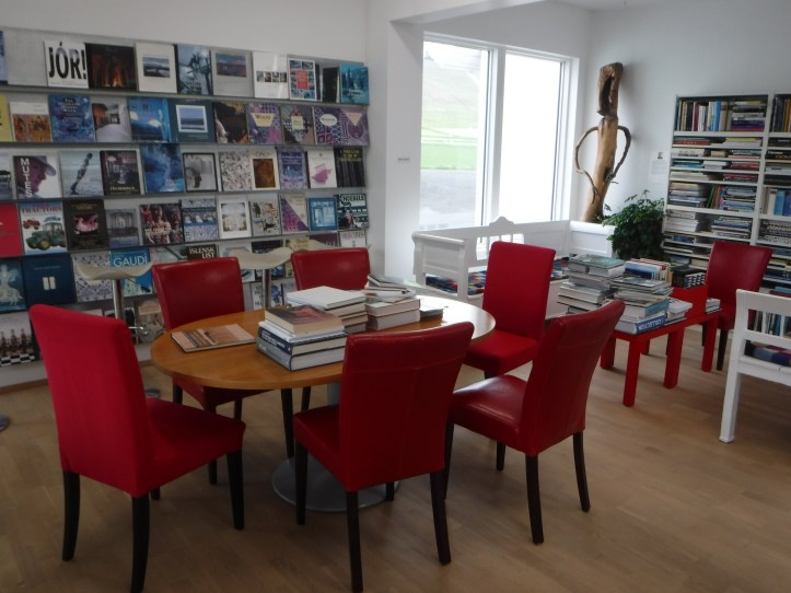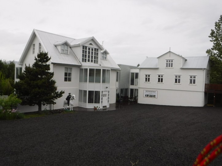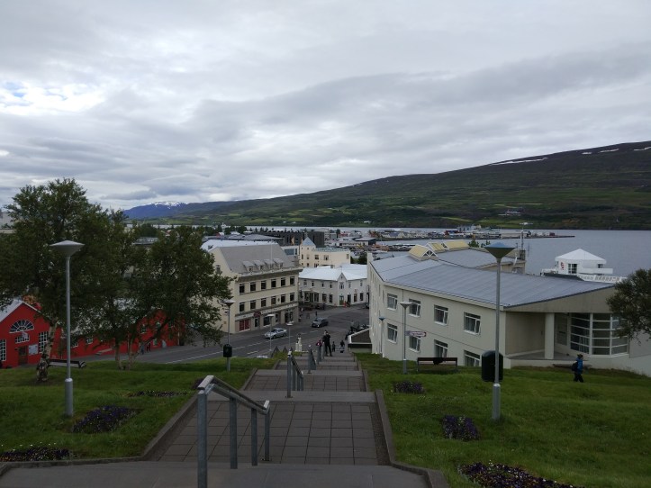 Almost as soon as I left Godafoss, the rain started, followed by the wind. Initially, the wind wasn’t too big a deal because it came from the south so was generally behind me, or coming on my left side pushing me into the kerb. When I got to the possible shortcut and the rain had increased, so I had a quick snack and decided to keep to the main N1. The road just climbed, and climbed and climbed. I had to stop a few times, but the gradient wasn’t too bad, it just seemed endless. Once at the top, there was a real switchback descent, which would have been really good fun on a dry windless day, instead I was on the brakes nearly all the way down. My destination, Akureyri, came into sight but my calculations said it should be over 20km away. I got my hopes up as it looked no distance at all. However, I hadn’t factored that the city is on the opposite side of the fjord, and I would need to go around the end and come back up the other side. As luck would have it, as I was becoming disillusioned a sculpture of a very tall man was at the side of the road, marking Safnasafnid – The Folk and Outsider Art Museum. It was raining, I fancied a stop and it looked interesting, so I stopped. It was actually very interesting, the buildings had a really good feel, and the curator explained it was an old school house that had been extended – it was really nice, and the setting with windows opening onto a stream down the side gave a really nice outlook – I’d live there! The art inside was interesting too, the work using Hama Beads (children’s iron together plastic beads), they looked very good en-masse. I was offered a free coffee and cake, as it was close to closing time (and everyone takes pity of wet cyclists!), and after I’d finished pushed on into Akureyri.
