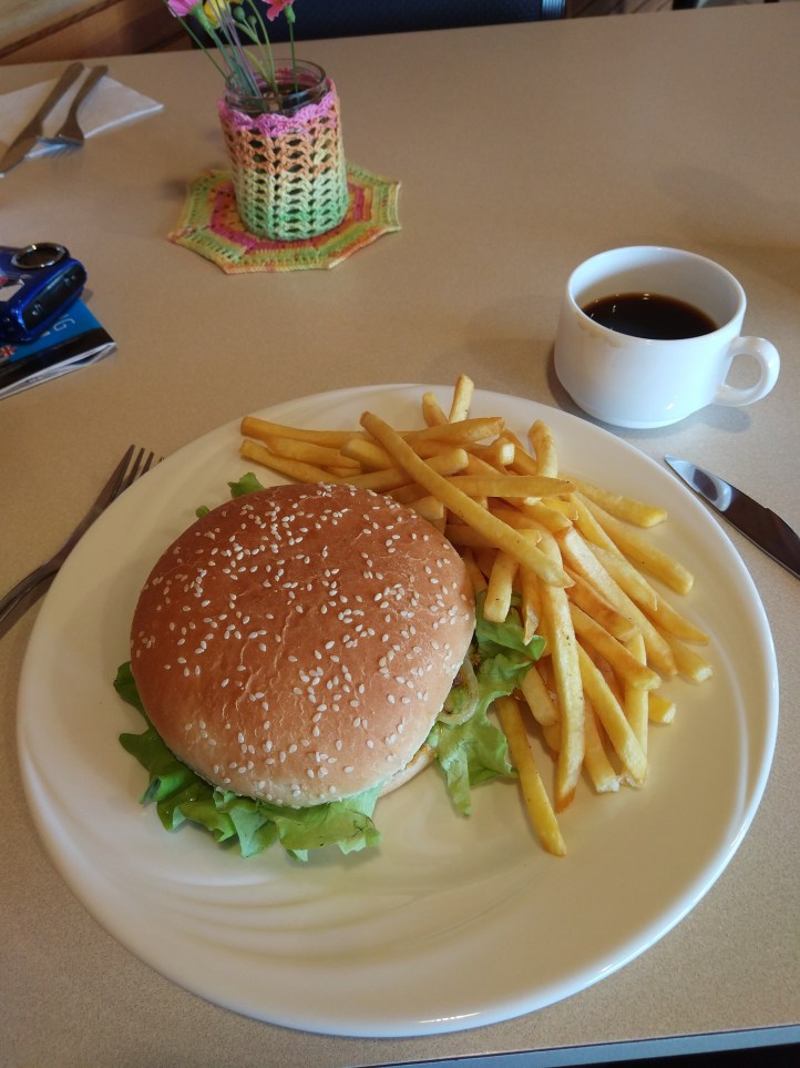 There were plenty of cyclists going the other way, but I think I had the better of the topography and the wind. I stopped at a N1 service station at Laugar after about 35 km, and rather than visit the food shop decided to treat myself to a burger, and a few cups of coffee.