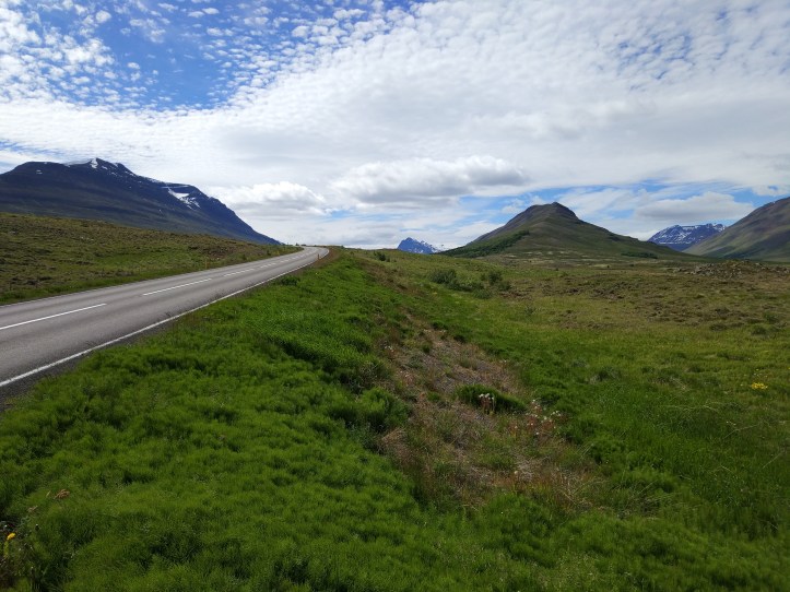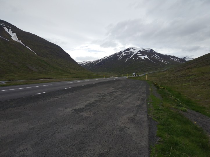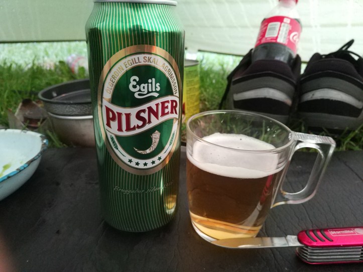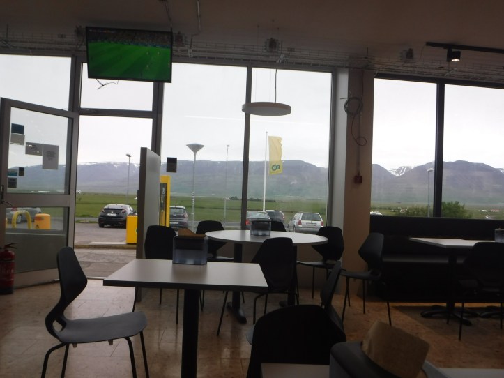 The tailwind never happened, if anything the headwind got stronger as the valley flattened out wider. I got to Varmahlid at about 6pm, after over 7 hours cycling. I was pretty tired, but passed one campsite on the plain, which had only one caravan, and no shelter – but I knew there was another behind the village near a forest which sounded better. I got to the N1 service station, and with only 900m to go to the campsite, according to the sign. I stopped. Coffee and cake were the order of the day (and plug sockets, and warmth, and world cup on the TV), I sat for a good while – until I realised it was starting to rain (as well as continue to be windy).