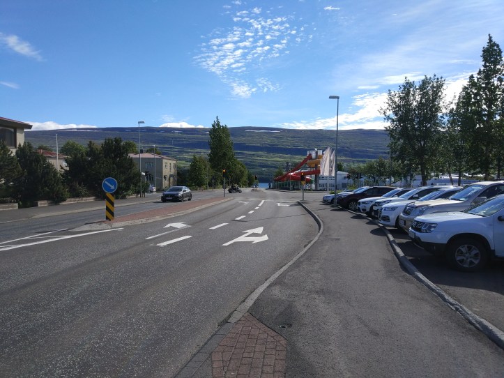 As I cycled into Akureyri, a cruise ship had pulled up in the harbour, and the inmates had been allowed to roam freely. They were everywhere, stood in the road, wandering aimlessly across traffic and single handedly mobbing the Tourist Information office. It seemed like they were trying to book taxis to most parts of Iceland. I should be grateful as I’m not sure the Tourist Information office would have been open without the “battery” tourists (I like to think of them as battery chickens – especially the ships with all the cabins having balconies on the outside look like cages). Anyway the Tourist Office seem pleased to help a cyclist with a simple bus problem. They suggested booking on line and then phone on Monday regarding the bike, as nobody would be around on a Sunday. My phone failed again, and so did the public access PC, so I’ll have to do it all by phone tomorrow. My final question was about supermarkets opening on a Sunday, and luckily the Netto opened at 10, so I had 20 mins to cycle there (the Bonus didn’t open until 12, which would have ruined all my plans – as I had little cycling food left).