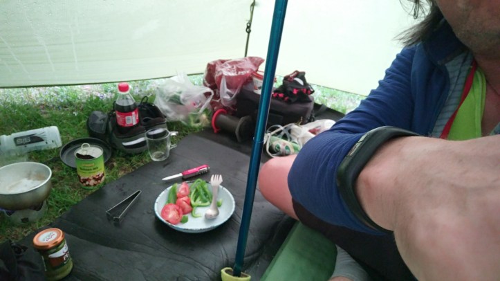 A quick food shop, and a cycle up a very steep hill to a nicely wooded, but still very wet and windy site. Found a sheltered corner for my tent which hopefully give it some protection. Pitched up the outer really quick and got everything inside, before starting to cook. There’s no kitchen or common sheltered area on this site which is a pity, but luckily my tent has plenty of room, the only question is will it stand up in the wind?