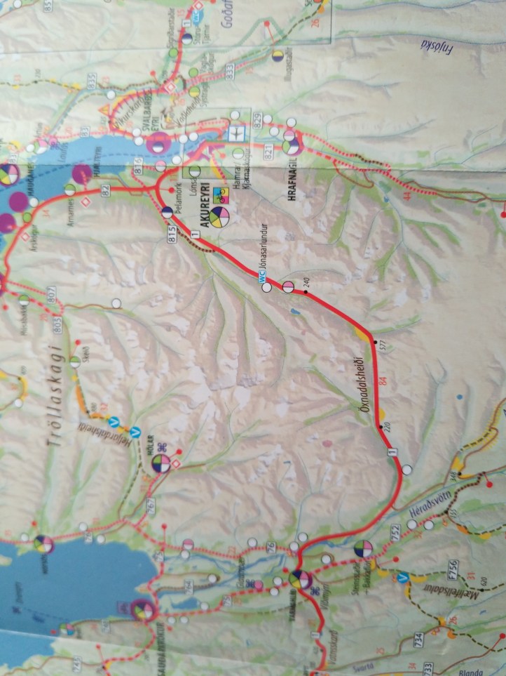 The more I thought about it, it clearly it wasn’t going to happen (but I always have a backup plan). In this case it’s the bus 610a, which is a rugged off road coach, which somehow goes from Akureyri to Reykjavik – 400km everyday on the gravel “Kjolur route”. The perfect solution except their website can’t take my booking. My plan today was to sort out the bus, and then cycle to near the start of the Kjolur at Varmahlid, about 100km which didn’t look too bad. There was only one thing showing on the map en-route, which appeared to be some sort of food stop.