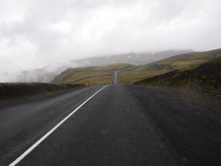 Anyway, on he road 435 the first sign I was greeted with was a 1km at 15% climb up a series of short hairpin bends. Straight away I had to walk but it was only a short distance. As I was walking up a wet road cyclist came down very slowly, with terrible squealing from his brakes on aero wheels. This gave me hope it wasn’t too bad ahead and there may be civilisation ahead. In fact the first bit was the worst, but I had to push up another three sections (and one section so steep I had to walk the descent). This area is very strange geologically, incredibly steep hills, and obviously a big geothermal area with steam rising all around and a heating pipeline following the road. Without shelter I had to eat some sandwiches huddled as best I could behind my panniers in a car park. A few tourists were around (all Americans), giving unhelpful comments from the warmth of their cars. To be fair, a lot of the locals would check you were ok, with a thumbs up as they drove past and I’m sure would have stopped if I indicated I needed help.