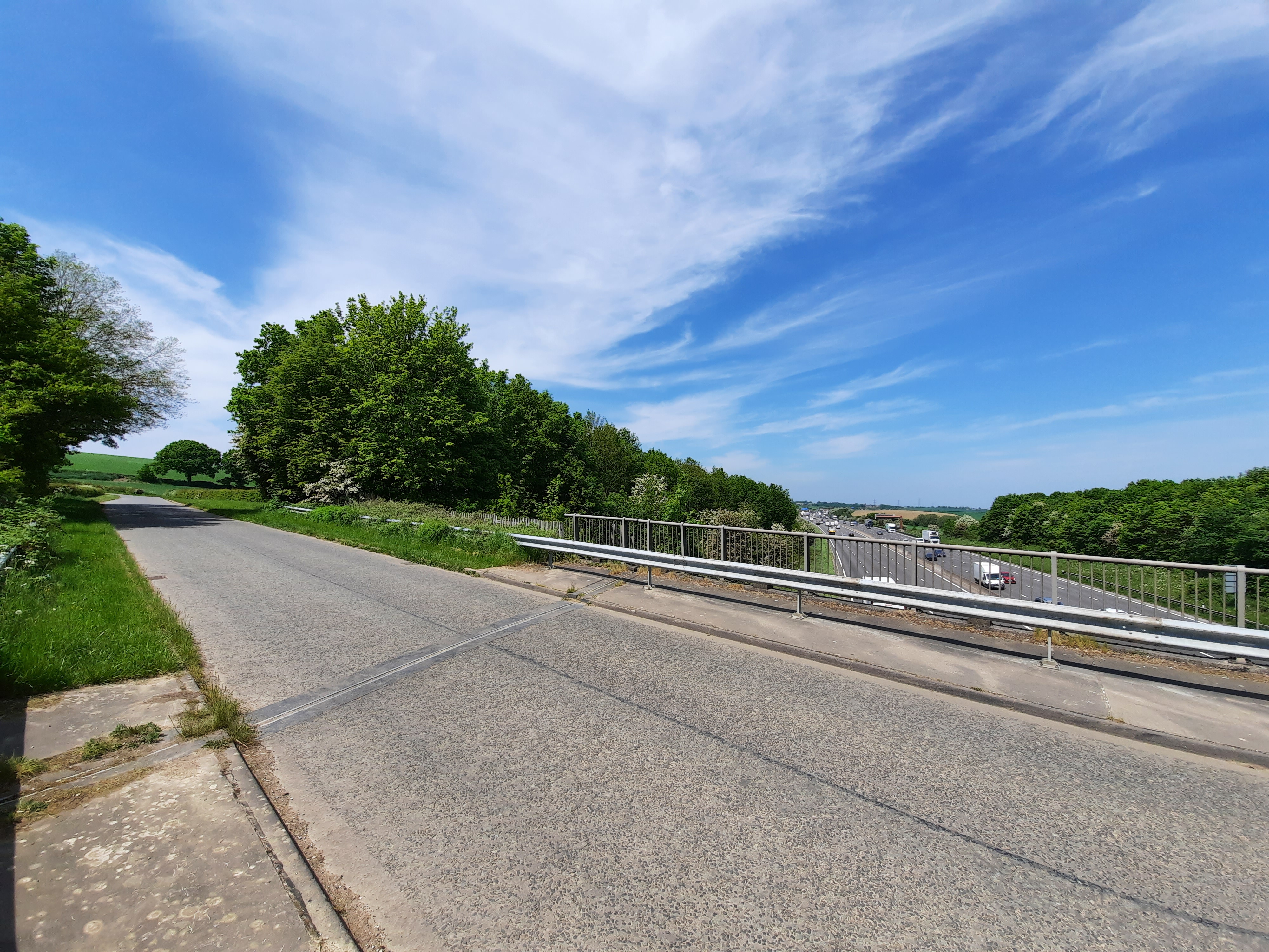 I’m not sure when the fun stopped! I’d had a nagging mechanical issue where when using the big front chainwheel, the chain would go into the spokes on the big sprocket at the rear. It was fine in the small chainwheel, so by careful shifting I was able to avoid a big issue. When it did drop into the gap, it lifted up relatively easily back onto the sprocket despite the panniers etc. However as the hills started this problem, requiring careful changing started to cause problems. I knew if it locked up on a steep climb it could be disaster, but equally stopping to fix it would probably make it worse (dérailleurs are a bit of a mystery without instructions). This meant that every hill was climbed in less than the highest gear, and I was too scared to get out of the saddle for short steep climbs. It came off a couple of times but easily solved. Anyway, it wasn’t until I reached Palerton that I could see how far I had climbed, with great views over the M1, to which I had to now descend.