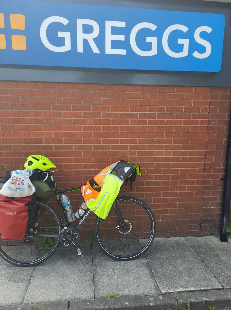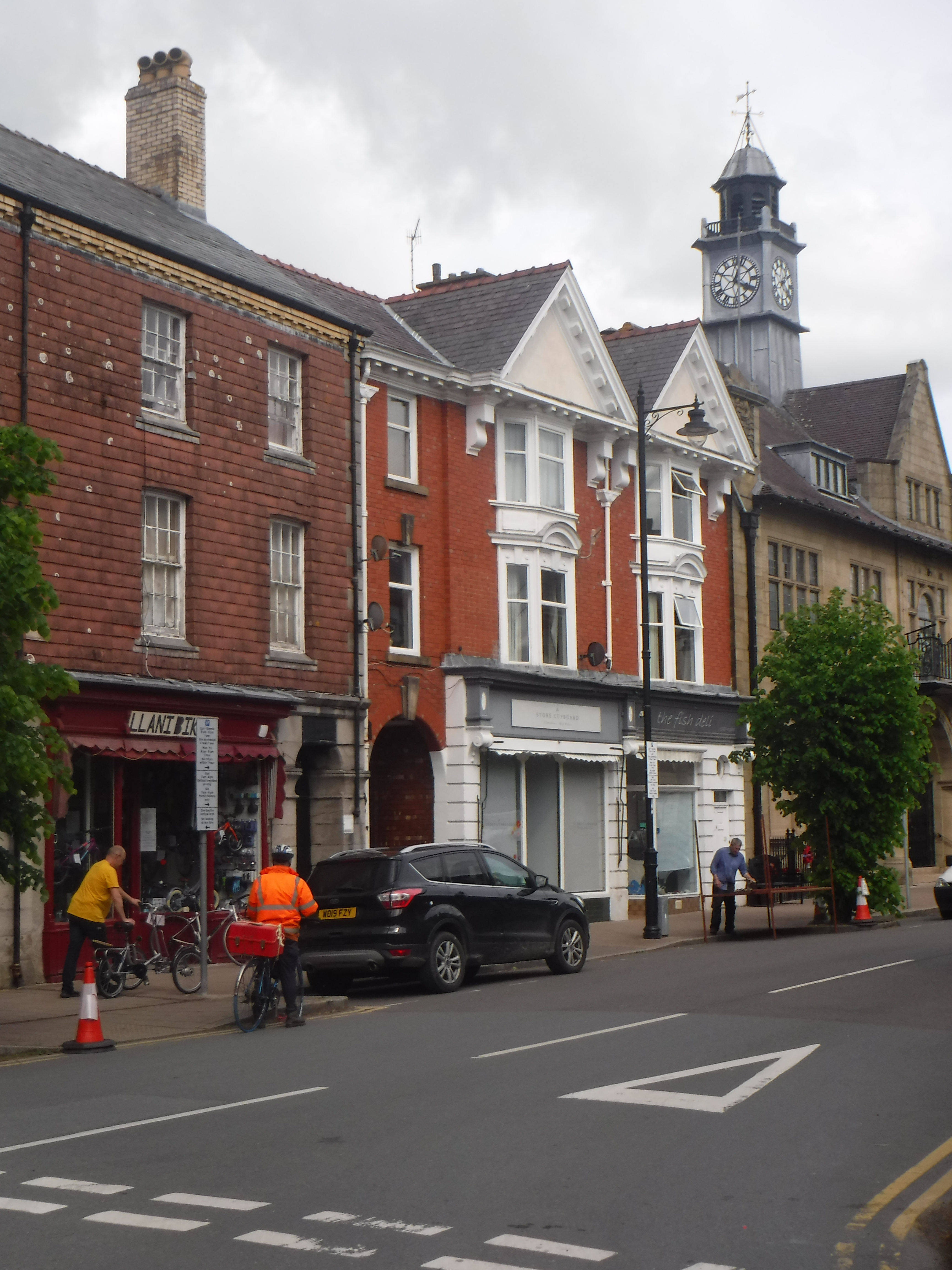 The first big town I came to was Newtown, which has a new bypass (which I know about as I’ve been involved in the drainage, tricky job due to steep hills/pipes!), but I headed into the town. A few grand buildings, shops and a chance for a photo opertunity for my biggest sponsor! I did have a Vegan sausage roll.