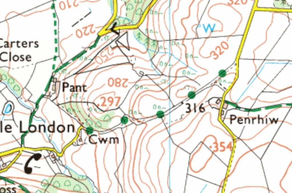 One of my sat-navs gave me a short cut, but after climbing higher there was a gate across the path, keep out, blah blah. The OS map (£2/month online – a bargain), showed a series of green spots on the route, which was a new one on me. It means, it is a route that most people accept is a right of way, but might not be!!
