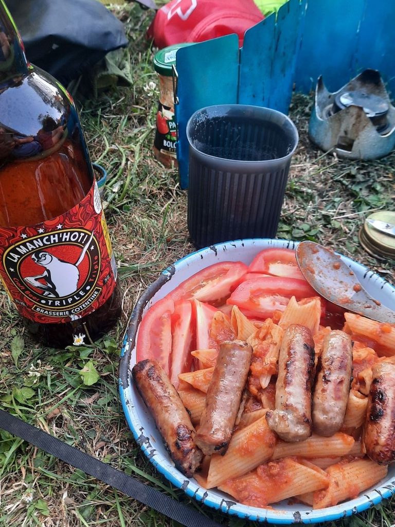 My next target is Gold Beach. I haven’t mentioned it, but Utah and Omaha are the beaches where the Americans landed. Gold and Sword beaches were the British, and Juno the Canadians (in broad terms). Anyway I am leaving the American zone, and it does feel like that. With the “Stars and Stripes” flying everywhere and I even passed a themed wartime shopping mall, advertising “Dollies Donuts”. I cycled into Port-en-Bessin about 4pm. It had been a cooking hot day and I felt like stopping for the day. A Huit-a-huit shop (8 to 8 – is that a service? late start, early finish hehe!) provided an exciting meal of Normandy chipolatas (from the butcher!), a bolognaise sauce and tomatoes as the vegetable! This will go well with my pasta mountain in my panniers.