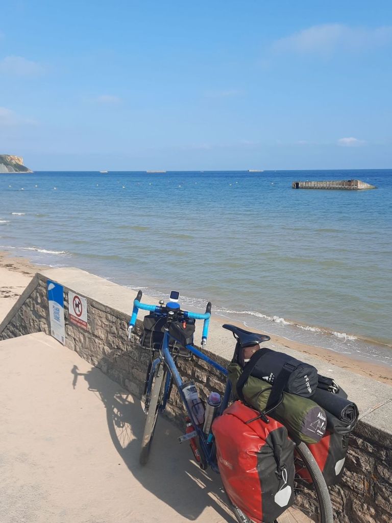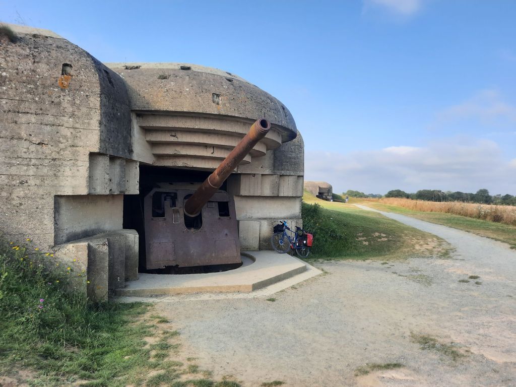 The campsite had “cyclists plugs” so I could recharge everything (I have been off grid since the ferry). This meant I could spend some time (sorry “battery” – which is my new measure of the progess of existence, and unlike your measurement of time, I can reset mine with a recharge!) putting a proper route into Garmin stopping at everything I want to visit. First stop after some really beautiful lanes, and cliff top cycle trail was Arrowmanches. There were some really impressive gun emplacements with the guns in place.
