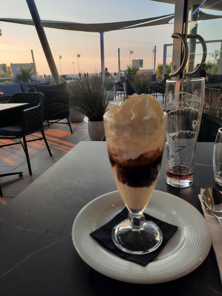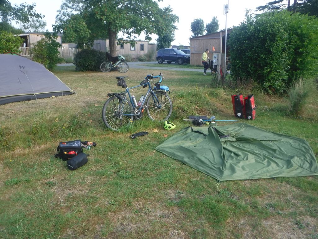 Found a good campsite, but it didn’t have a bar or restaurant. So I pitched my tent on a nice sandy pitch and tested the facilities. Shower excellent, toilets €14 tp No, ts No. Clearly you need to pay over €15 if you want a ts! Headed into Merville-Franceville-Plage for Entrecot avec Poire sauce and a Cafeliege. Perfect.