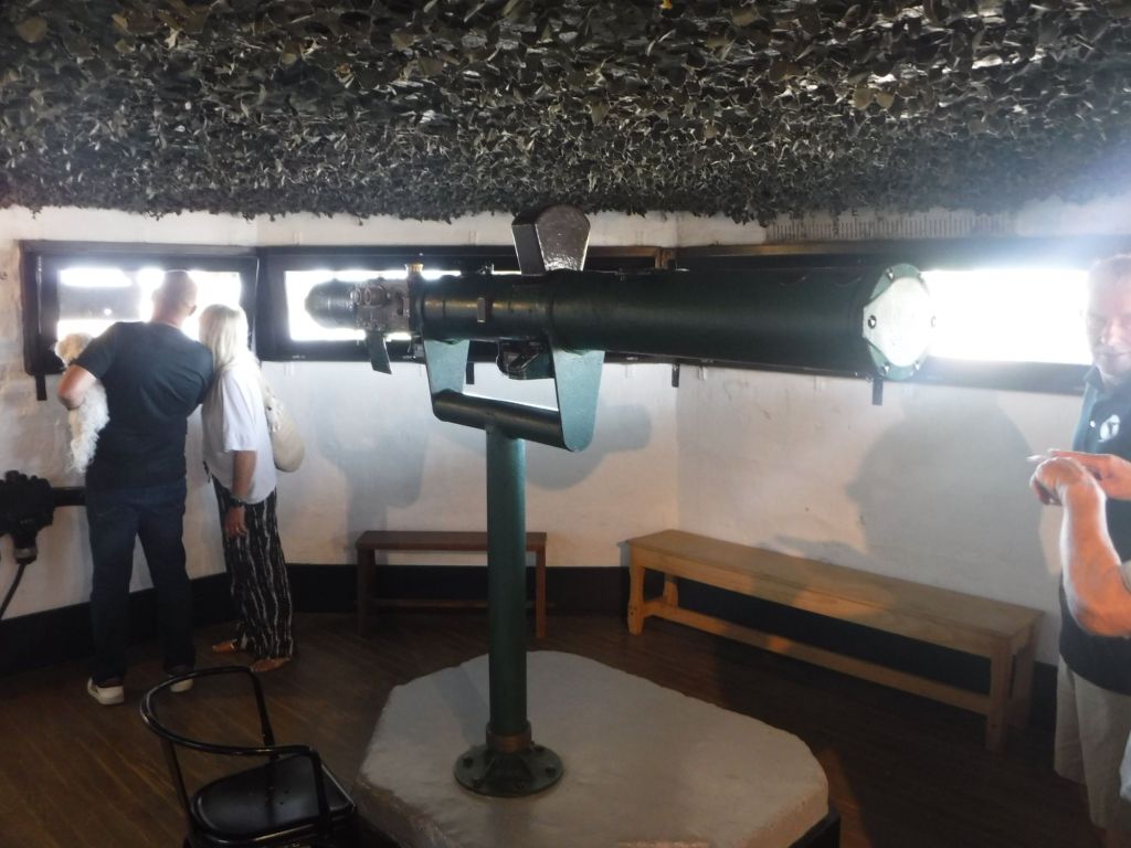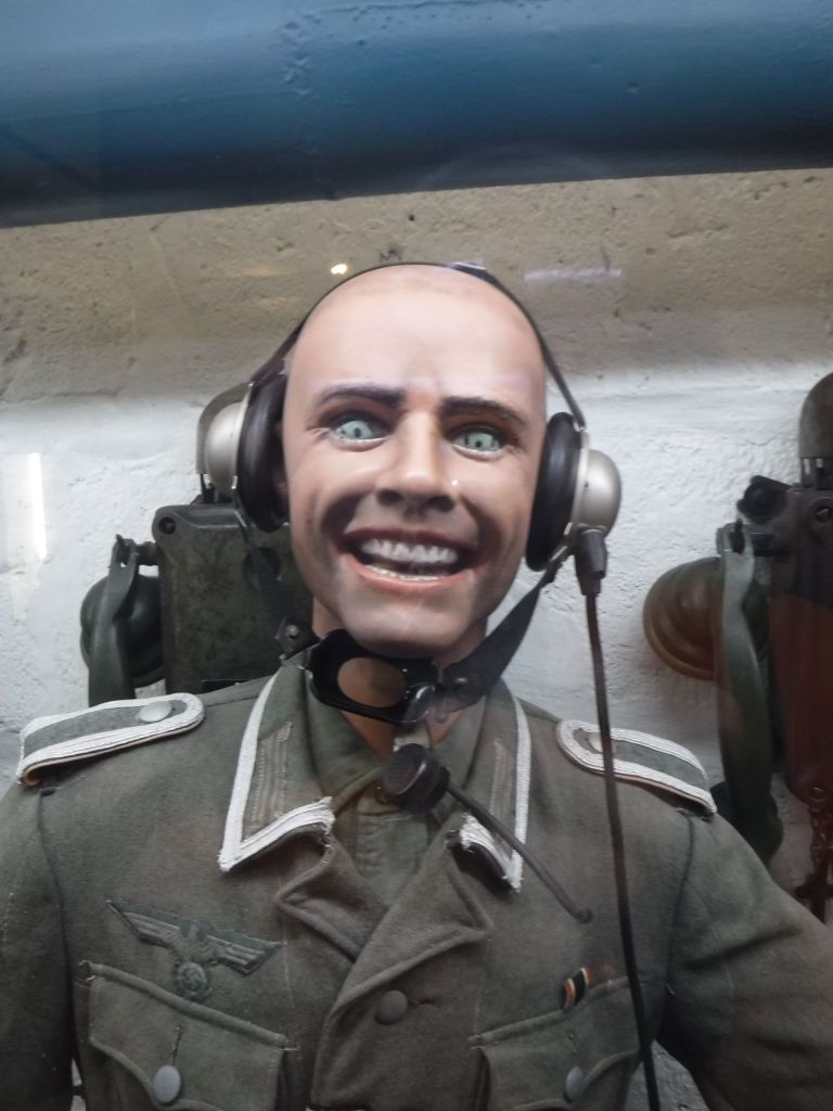 It was fully kitted out with equipment from when is was used. The story of how it was captured is quite remarkable. Three Royal Engineers (led by a Civil Engineer) tried to blow the door off without success, then crowbars and eventually another blast. As they got it off, a voice said, “come on up”, to which the engineers said “No, come on out”. The three of them took 55 Germans prisoner without incident. The range room has a big “range finder” and can see a huge expanse of ocean. The target locations were then radioed to the batteries along the coast. Climbing the metal ladder to the roof was interesting, and whoever styled the crazy radio operator needs a medal.