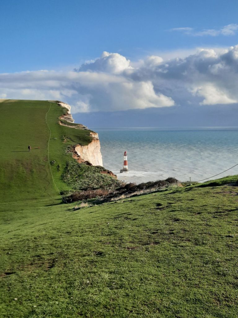 From Birling Gap I headed over the Seven Sisters, these are the names for seven peaks (and corresponding troughs) of the beautiful white ciffs. They are named Went Hill Brow, Bailey’s Hill, Flat Hill, Flagstaff Point, Brass Point, Rough Brow, and Short Brow. They all look the same, with nothing to differentiate any of them. I was rather hoping for a Flagstaff on Flagstaff Point so I could orient myself. I expect these paths are very busy at weekends and in the summer, but it was glorious having them pretty much to myself in the sunshine today. There were a few people out, including a flim crew, but it was so quiet.