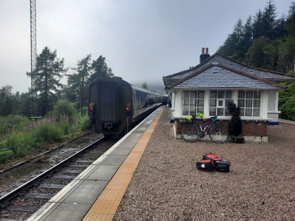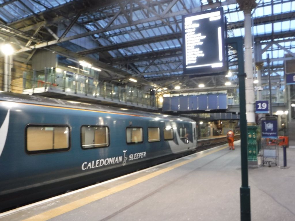 I’ve referenced this as post as starting (startiaboutng) [I’ve left this word in as it shows what WordPress is doing to my posts when I‘m not looking! Getting my excuses in early] in Tyndrum, but obviously, I started in London on the Caledonian Sleeper. I had a nice big single seat (the train is made up of 3 seats wide, a double, a wide passageway a single), but I must admit to not getting much sleep. This wasn’t helped by the need to change carriages at 4 am in Edinburgh. I couldn’t really understand why I would have to change while anyone in a bed could just sleep through. The reason is that they only put one seating carriage on in London, and when the train splits in Edinburgh (half to Aberdeen, and half to Fort William) and at Edinburgh they put on another after the train splits. So at 4:30 am, half a dozen of us are waiting for carriages to be attached. They actually attached four, or maybe more, carriages, which made us a very long train. This meant when we arrived in Tyndrum, the front of the train pulled in first to unload, and then edged along to my carriage to that two of us in “peasant class” could disembark.