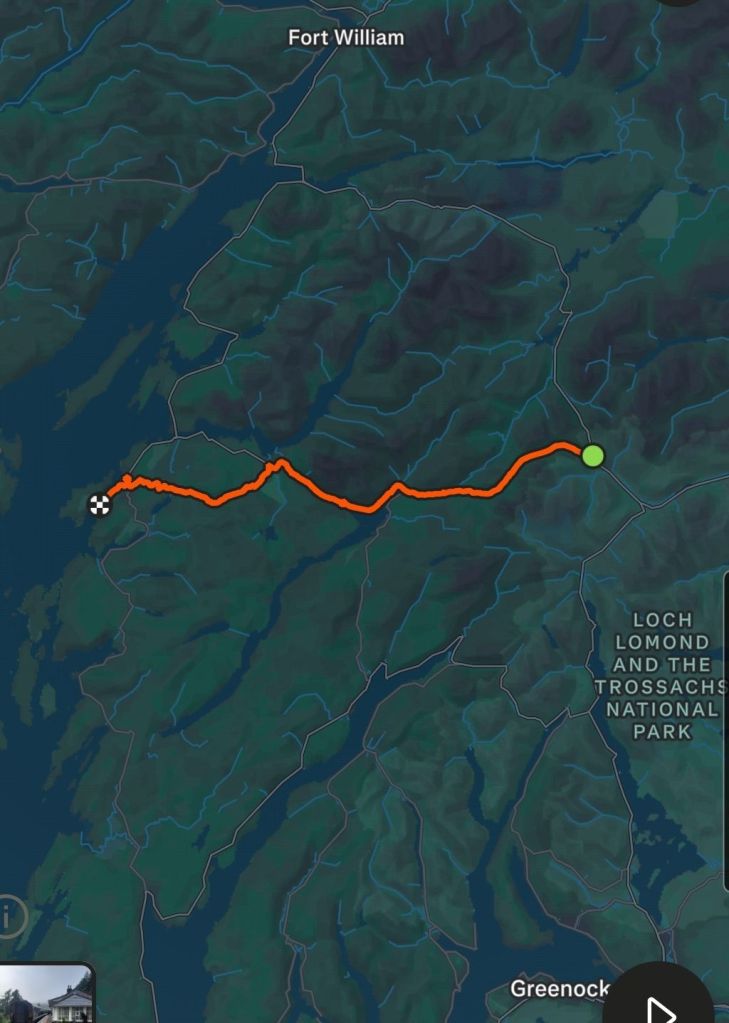 The cafe was remarkably busy with walkers of many nationalities, with seeming big groups of French and Germans. This is because this is on the West Highland Way (100 mile path from Glasgow to Fort William) and walkers were streaming past the window. It reminded me of being on the Camino. I had two choices of route, 1) starting as a scenic “gravel” route or 2) direct on the A85 (the first route was 10km longer, but avoided 10km of busy road). When I was planning to get to Oban, I was aiming for the Western Isles ferry that has a normal check-in time of 2 pm, so I picked the station/town that looked the fastest ride. The ferry was subsequently changed due to operational reasons to a 10am check in, which is an impossible ride. So I’m catching the ferry tomorrow, giving me time to consider the scenic route.