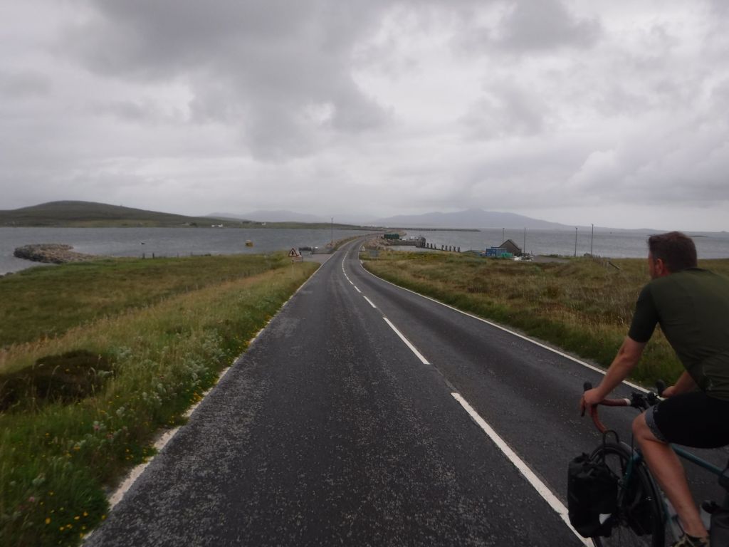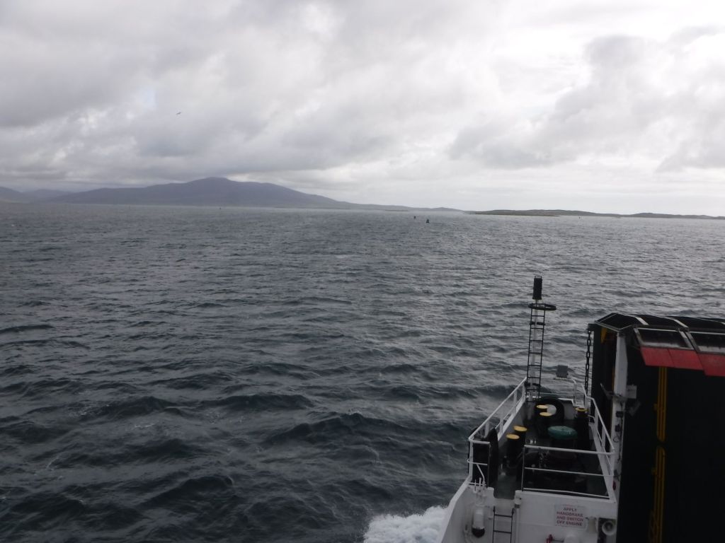 We reached the causeway between North Uist and Bernay. Its quite a long one, and was only opened in 1999. We were the first bikes to arrive, although there were lots of cars and vans hoping to get their space. While a bicycle and rider is £4.05 for the hour crossing, a car and driver is over £21 plus £4.05 for each passenger. A big motorhome could be over £60. Bicycle is certainly the way to travel.