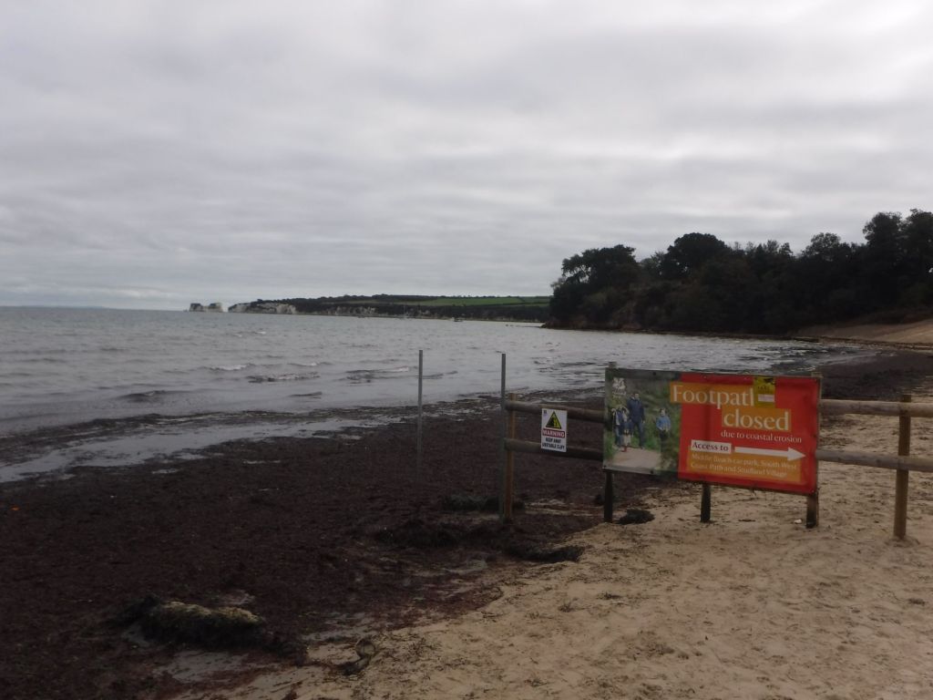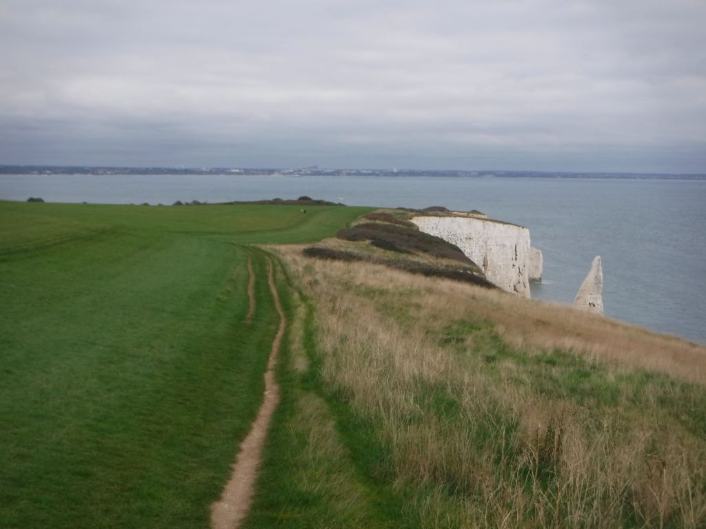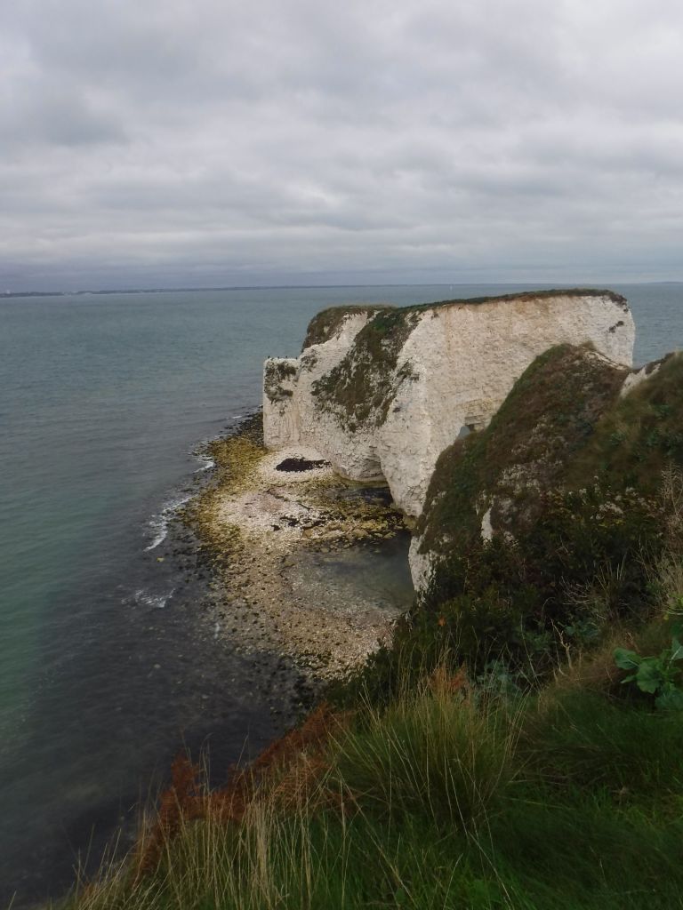 I then took the footpath to Old Harry’s Rocks. I was good to get off the beach, but as I started walking, as well as chatting to a workman who was trying to repair the Ladies Public Toilets, (he said it was very difficult to get any work done as ladies keep wanting to use it), there were three police cars and an ambulance. It seemed something was going on on the beach. I headed up towards the headland, getting a walking pole out as this was going to be the first substantial hill since Eastbourne, which was my third day of walking and I think this is my 18th. A Coastguard 4×4 came past on the track, as well as quite a big group of people coming back the other way, so something was going on here as well. Then two Coastguard 4x4s, with maybe ten personnel, reversed back past me, so maybe it was over. But then came across a Police 4×4 with climbing ropes tied to its wheel, disappearing into the bushed and presumably down the cliff. It was on a narrow track, and I had to squeeze past. Then a single policeman (with a paramedic) asked, very politely, whether I’d been stopped from walking up from Studland. I obviously said no, supported by a couple with a baby in a backpack, who I overtook on the way up. He was turning back people coming from the other direction. Nobody had any idea what was going on, and It looks like I had a lucky escape as I could have been delayed even more. I had Old Harry’s Rocks to myself before heading off on the cliff top.