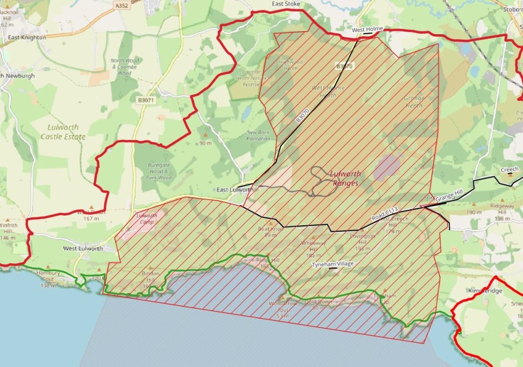 There is another story to be told before I start on the walk. I’d meticulously planned this two day section (clearly not enough after yesterday’s delay scuppered my main plan) and as soon as I booked the accommodation (nonrefundable), I decided to check the opening times for the MOD Lulworth Firing Ranges. I’d rather assumed they would be closed occasionally, and I’d be unlucky to pick a closed date. How wrong I was! They are closed pretty much every week day and some weekends, with a detailed plan published for each day. This was a big blow as on Thursday 16th October pretty much everything was closed, except the B3011 which didn’t help much. I struggled to match the MOD names up with the Ordnance Survey maps, but I think the map below might help someone in the future.