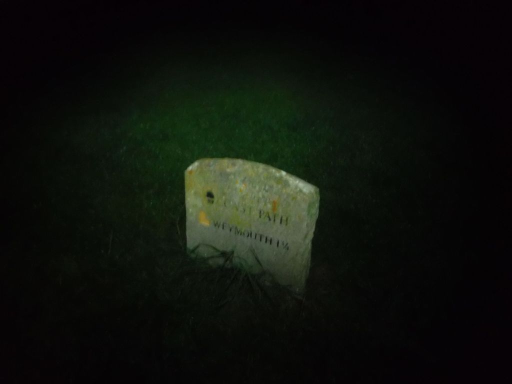 I reached Osmington Mills just before the sun disappeared. I couldn’t find a tap on the map, as I was short of water, but there was a pub. So I substituted water for a pint of bitter shandy, checked my route and got my torch out. It was around 6 km to go, although I was a bit unsure of the actual distance as I had lost confidence in my overall measure, and I was converting the miles from the signposts. Also, I was unsure where in “Weymouth” the signs were referring. I could see that Weymouth had a very long seafront, and if they meant the “Welcome to Weymouth” point, it would really mess up my calculations. At the pub I checked on the train times, and my last train was 20:06. It all seemed a bit tight!